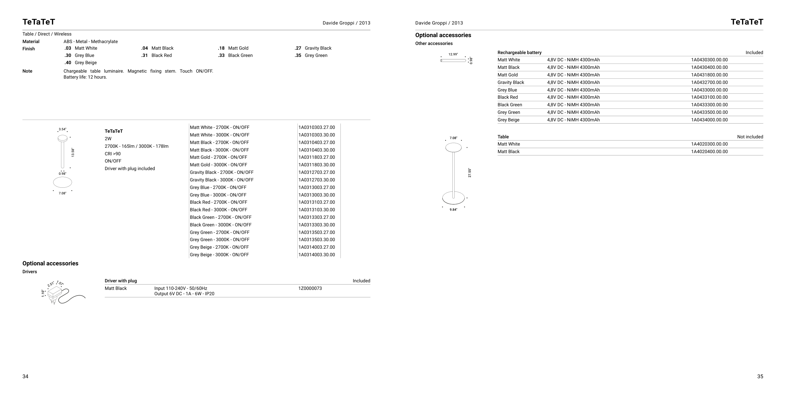 Chargeable table luminaire. Magnetic fixing stem. Touch ON/OFF.