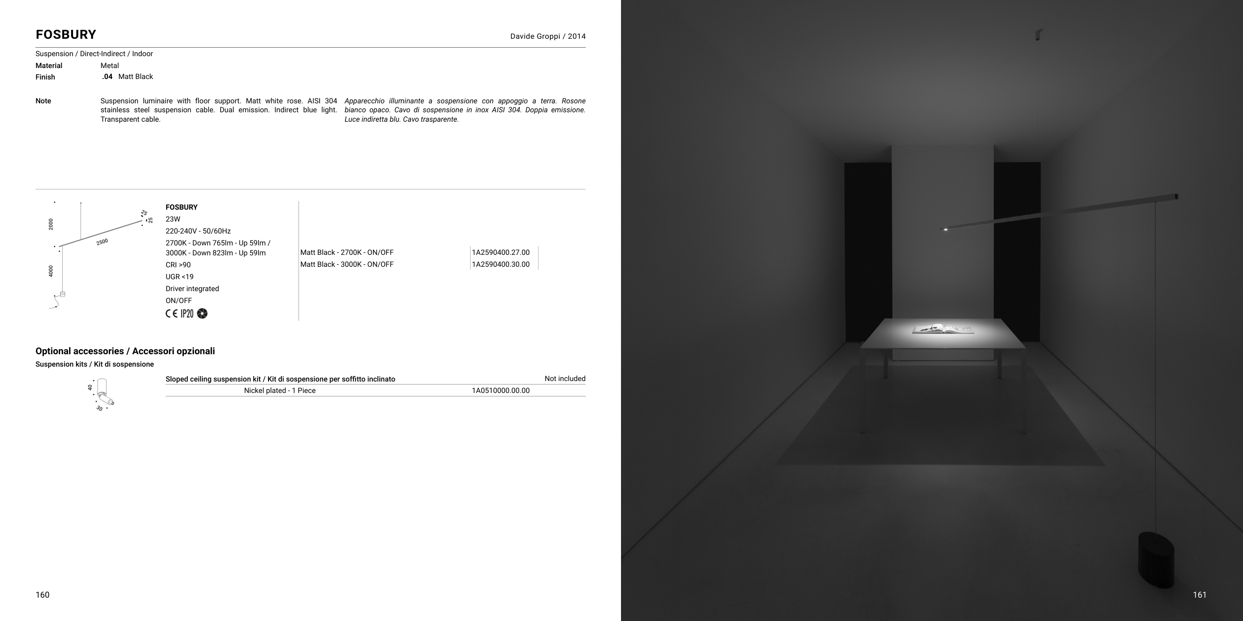 stainless steel suspension cable. Dual emission. Indirect blue light.