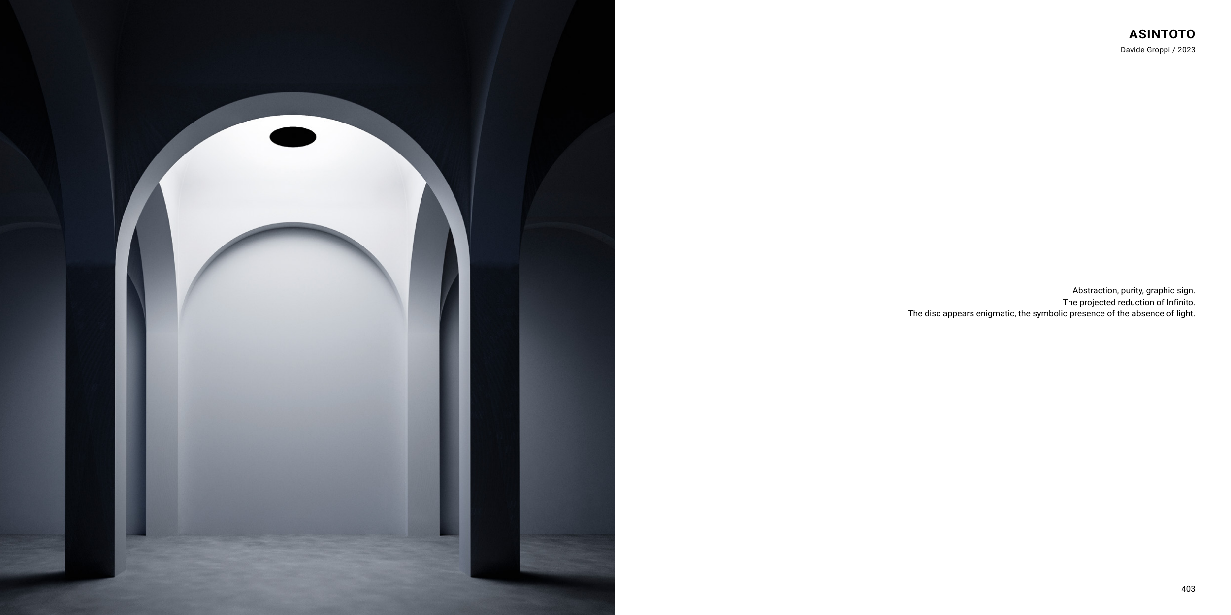 403 ASINTOTO Davide Groppi / 2023 Abstraction, purity, graphic sign. The projected reduction of Infinito. The disc appears enigmatic, the symbolic presence of the absence of light.