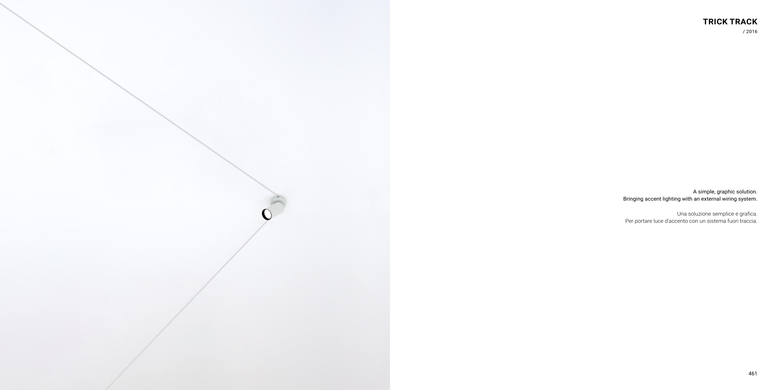 461 TRICK TRACK / 2016 A simple, graphic solution. Bringing accent lighting with an external wiring system. Una soluzione semplice e grafica. Per portare luce d'accento con un sistema fuori traccia.