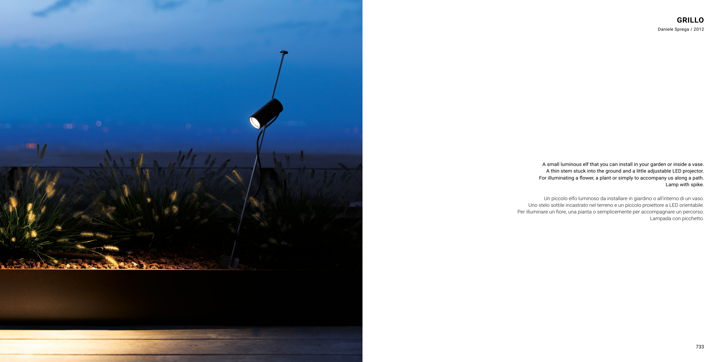Uno stelo sottile incastrato nel terreno e un piccolo proiettore a LED orientabile.