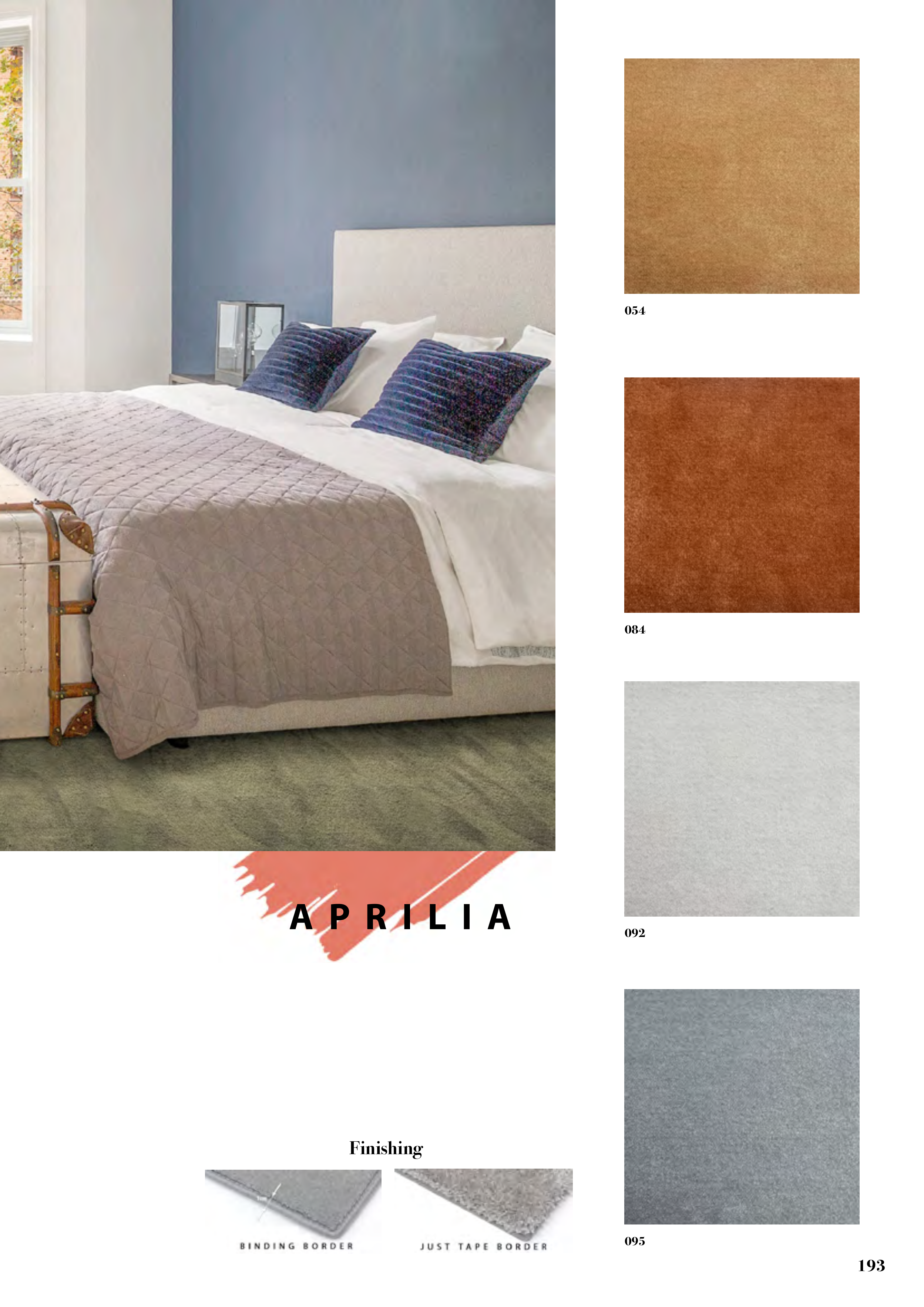 193 A P R I L I A Composition: 100% polyamide Production: Mechanic Pile height: 5,5 mm Total weight: 1.690 g/sqm Roll width 400 cm max, length 2000 cm max Suitable for custom made rugs or wall-to-wall 054 084 092 095 Finishing