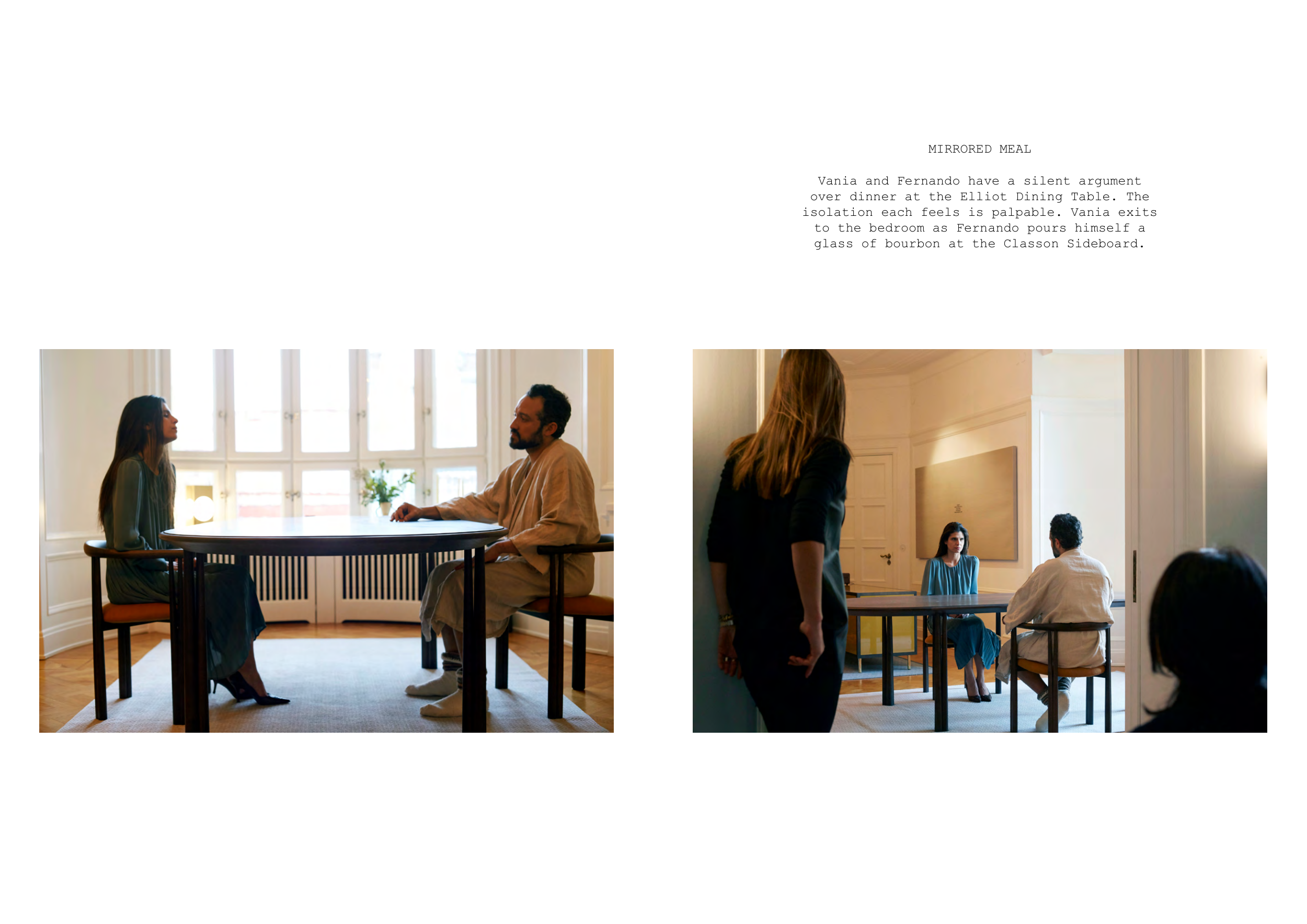 MIRRORED MEAL Vania and Fernando have a silent argument over dinner at the Elliot Dining Table. The isolation each feels is palpable. Vania exits to the bedroom as Fernando pours himself a glass of bourbon at the Classon Sideboard.
