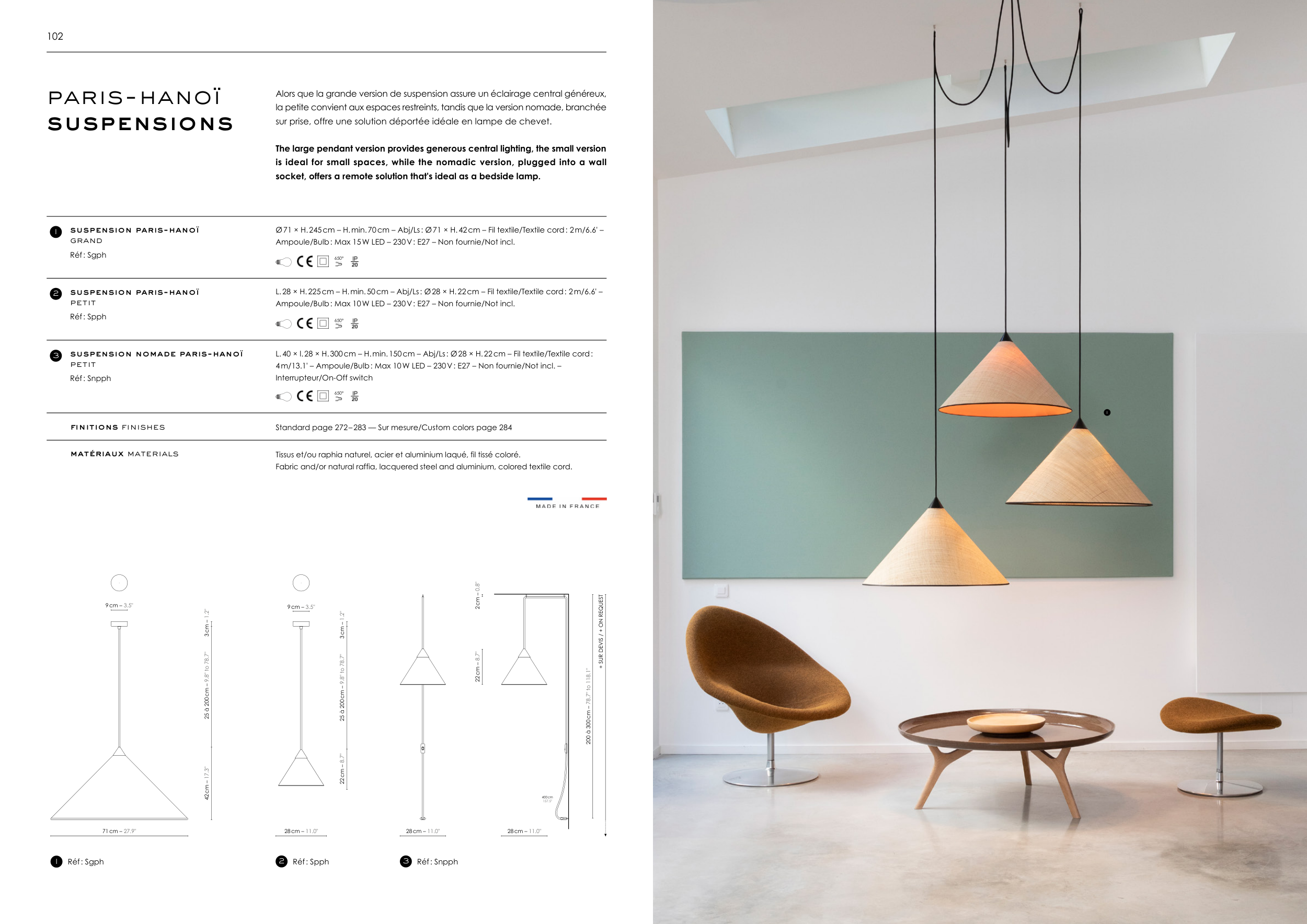 L. 28 × H. 225 cm – H. min. 50 cm – Abj/Ls : Ø 28 × H. 22 cm – Fil textile/Textile cord : 2 m/6.6' –