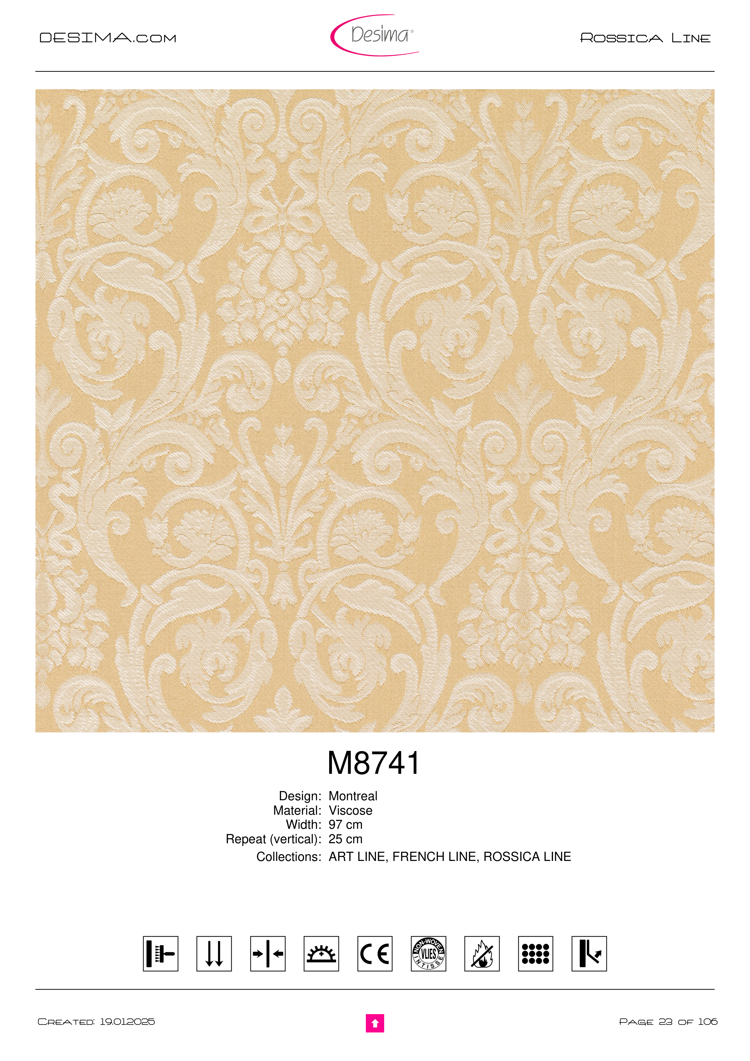 DESIMA.com Rossica Line M8741 Design: Montreal Material: Viscose Width: 97 cm Repeat (vertical): 25 cm Collections: ART LINE, FRENCH LINE, ROSSICA LINE Page 23 of 106 Created: 19.01.2025