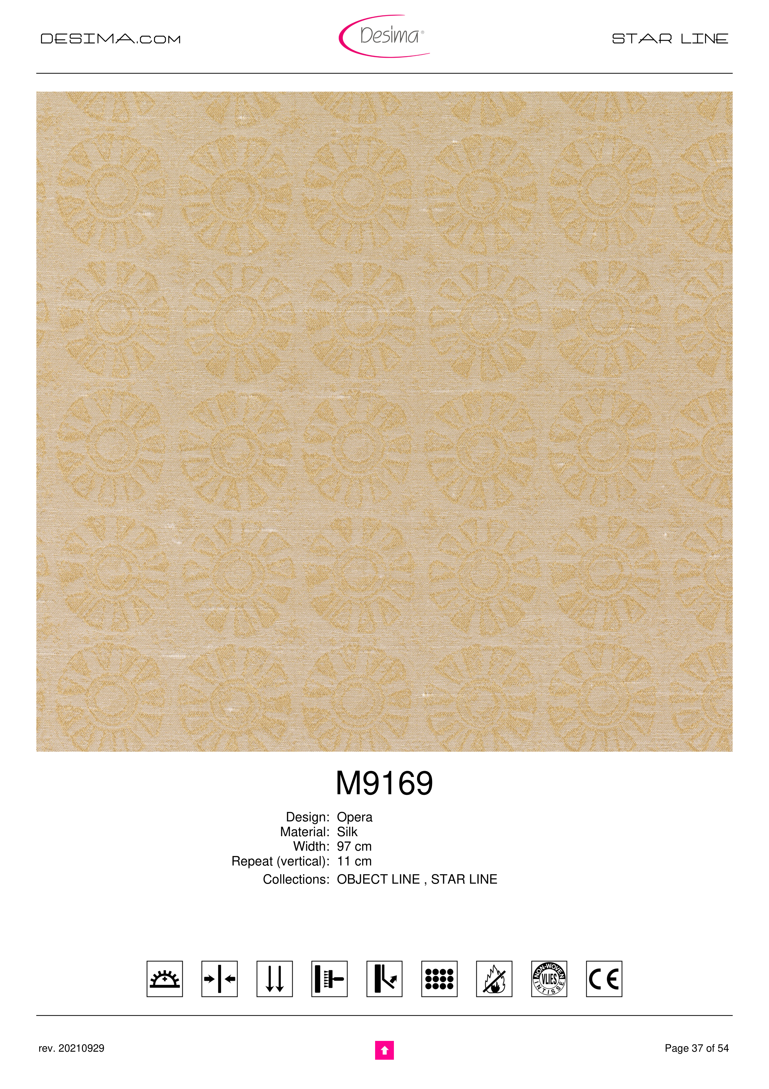 DESIMA.com STAR LINE M9169 Design: Opera Material: Silk Width: 97 cm Repeat (vertical): 11 cm Collections: OBJECT LINE , STAR LINE Page 37 of 54 rev. 20210929