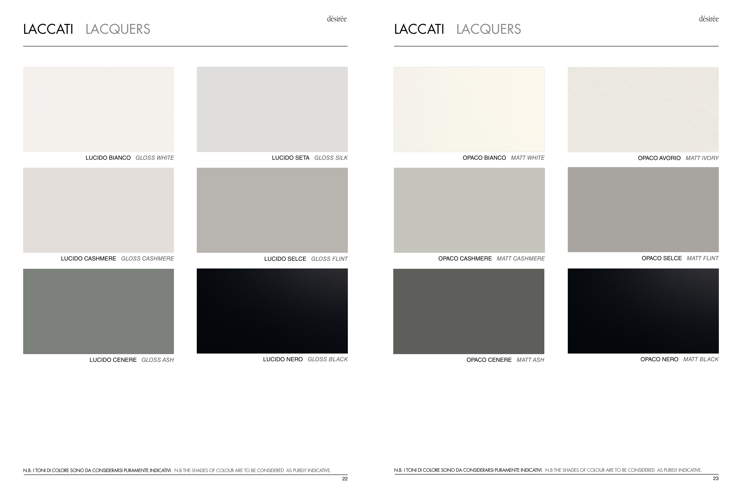 N.B. I TONI DI COLORE SONO DA CONSIDERARSI PURAMENTE INDICATIVI. N.B THE SHADES OF COLOUR ARE TO BE CONSIDERED AS PURELY INDICATIVE.