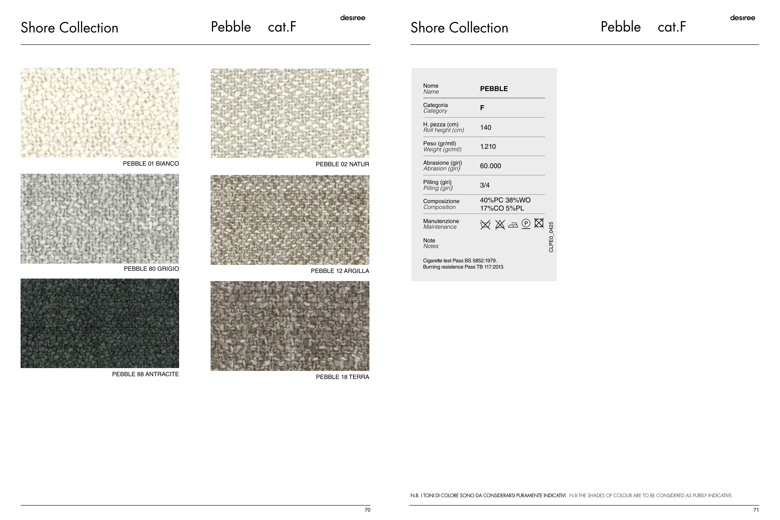 N.B. I TONI DI COLORE SONO DA CONSIDERARSI PURAMENTE INDICATIVI. N.B THE SHADES OF COLOUR ARE TO BE CONSIDERED AS PURELY INDICATIVE.