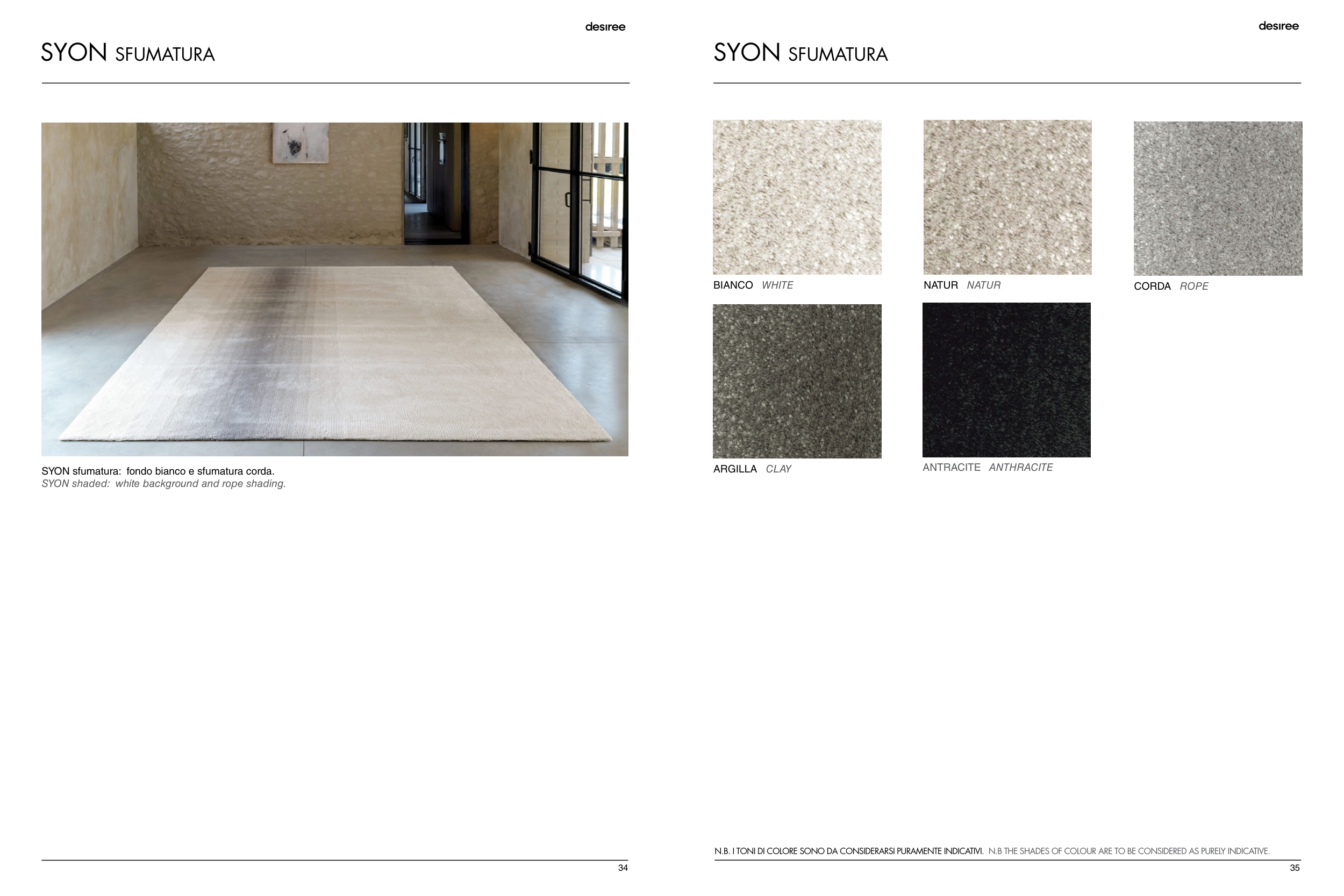 N.B. I TONI DI COLORE SONO DA CONSIDERARSI PURAMENTE INDICATIVI. N.B THE SHADES OF COLOUR ARE TO BE CONSIDERED AS PURELY INDICATIVE.