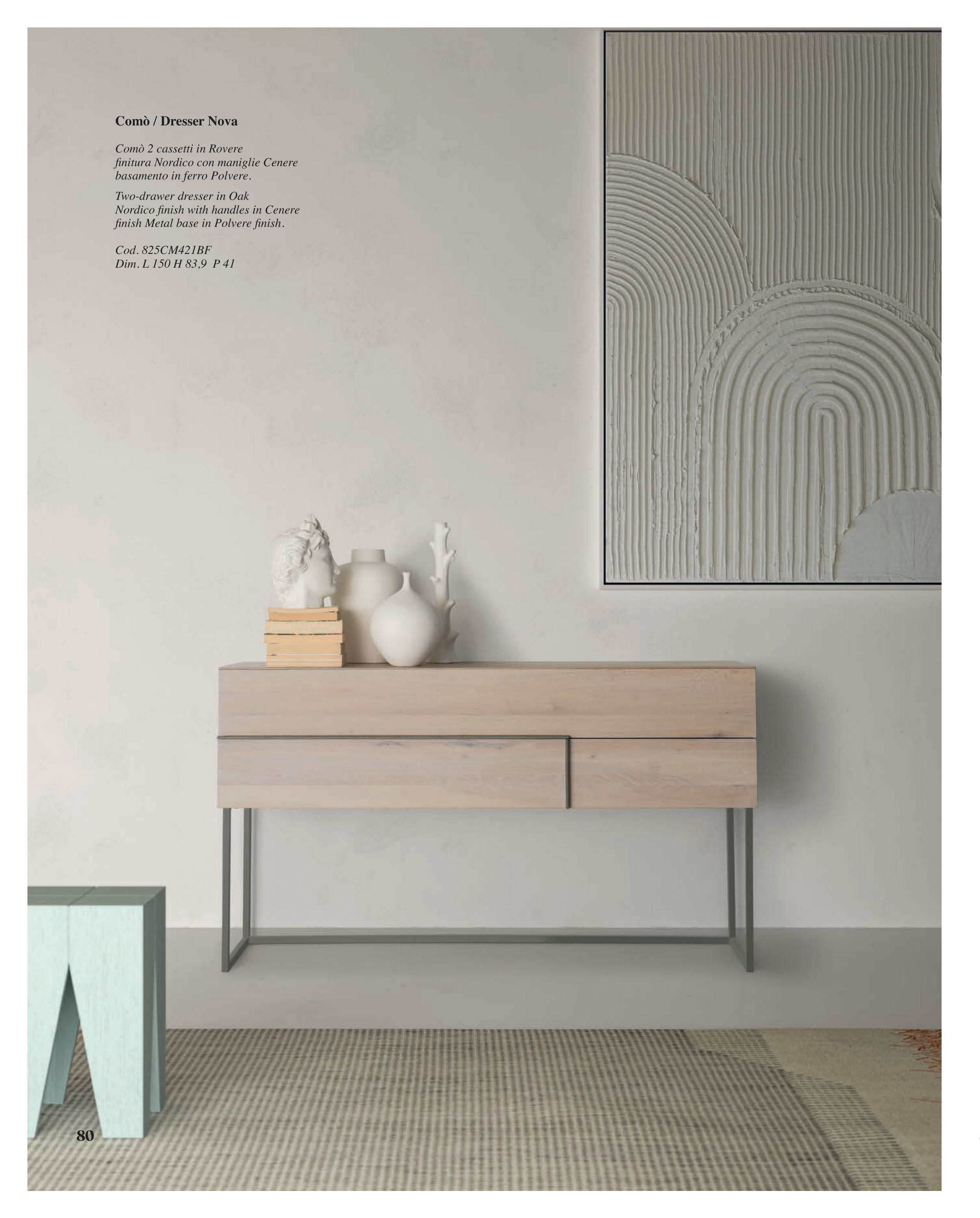 Comò / Dresser Nova Comò 2 cassetti in Rovere finitura Nordico con maniglie Cenere basamento in ferro Polvere. Two-drawer dresser in Oak Nordico finish with handles in Cenere finish Metal base in Polvere finish. Cod. 825CM421BF Dim. L 150 H 83,9 P 41 81 80