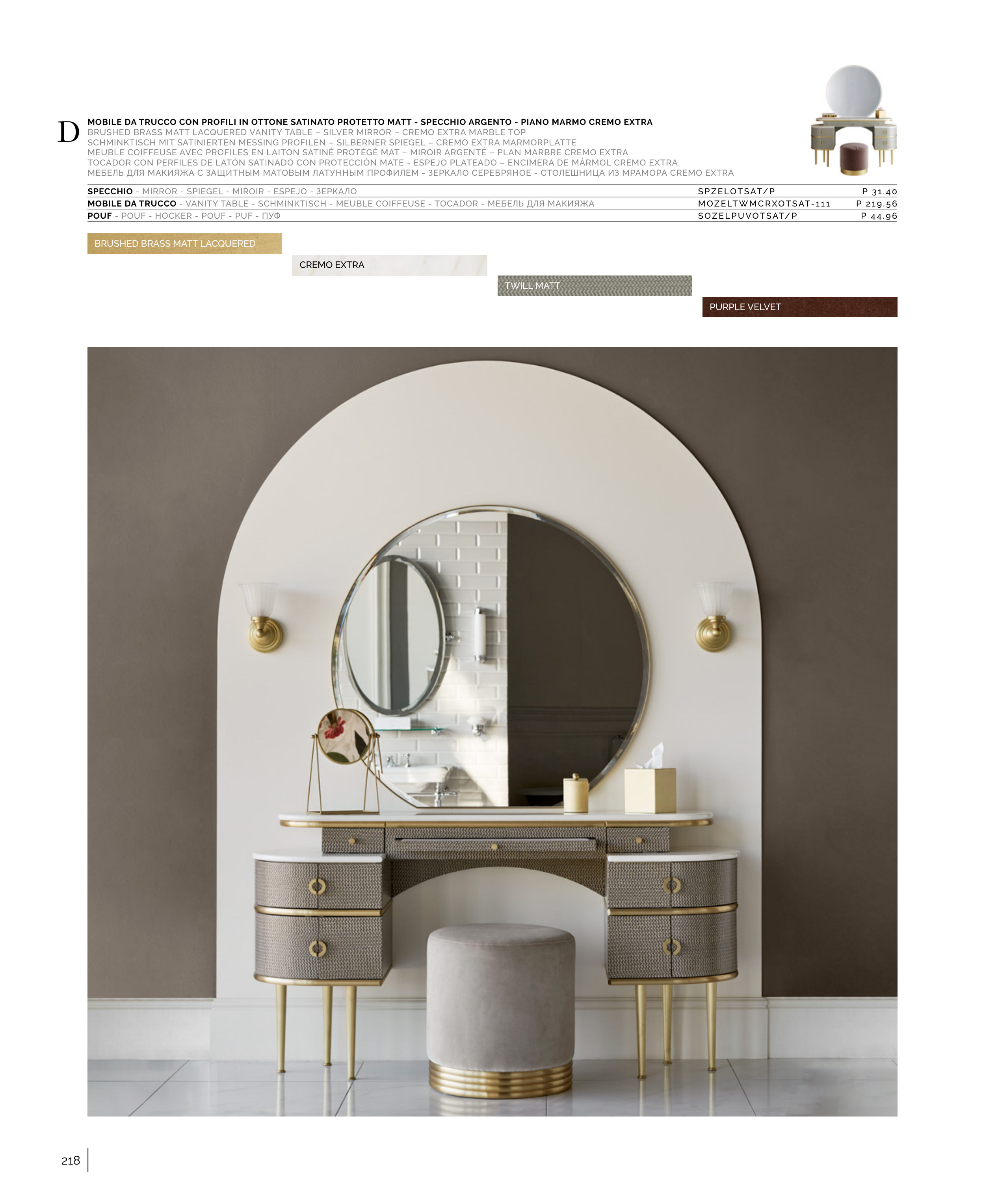 BRUSHED BRASS MATT LACQUERED VANITY TABLE – SILVER MIRROR – CREMO EXTRA MARBLE TOP