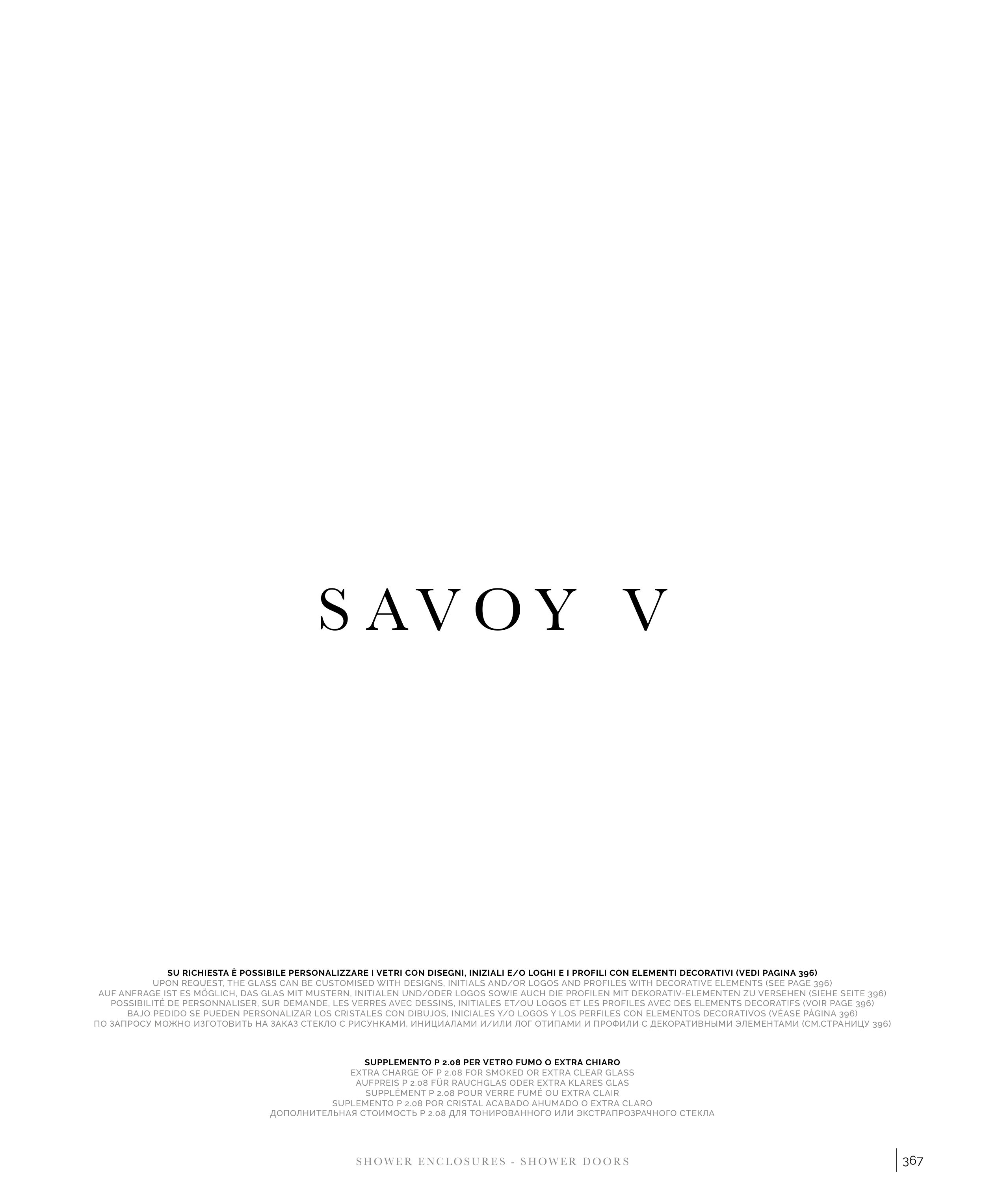 UPON REQUEST, THE GLASS CAN BE CUSTOMISED WITH DESIGNS, INITIALS AND/OR LOGOS AND PROFILES WITH DECORATIVE ELEMENTS (SEE PAGE 396)
