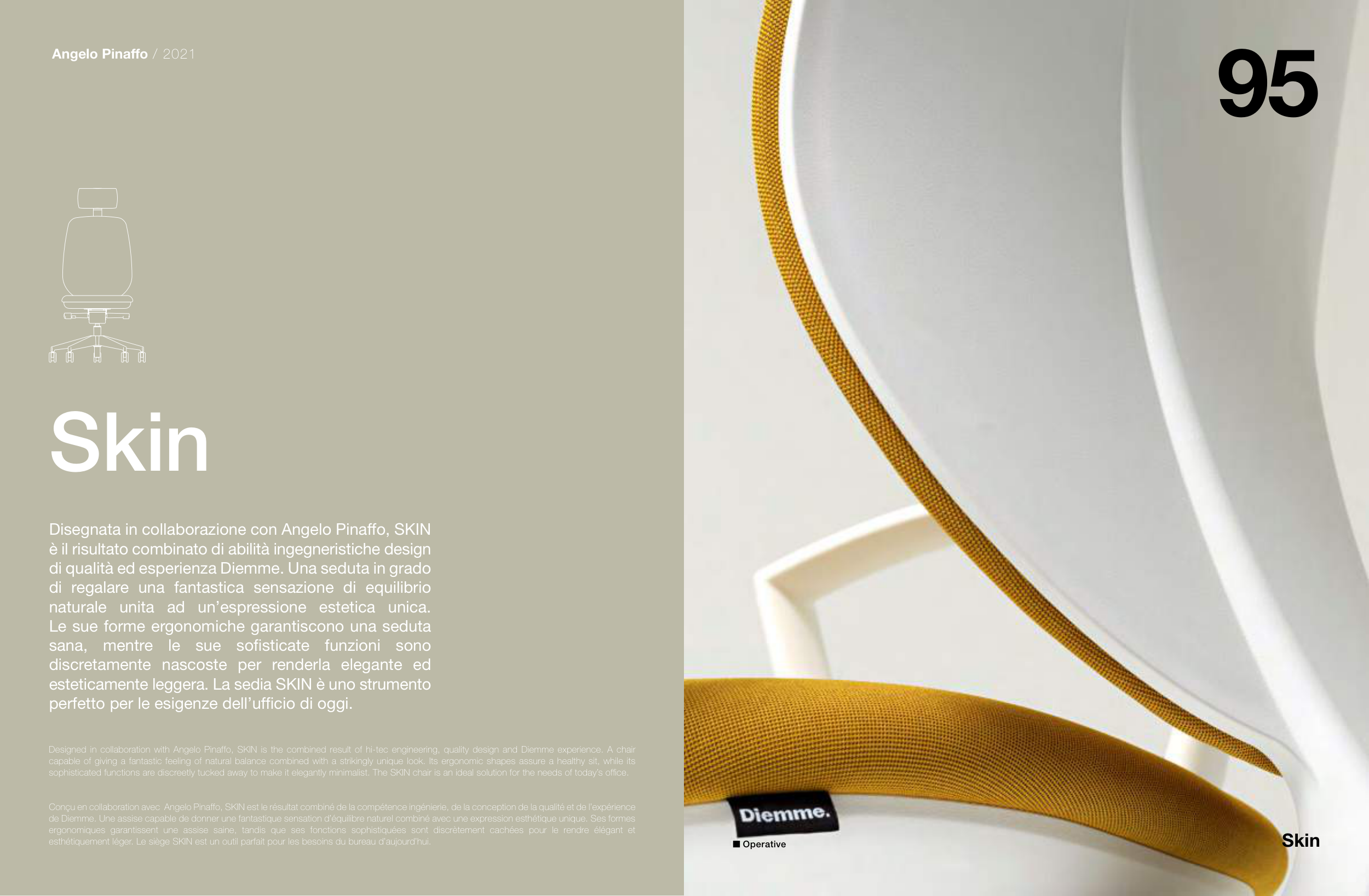 Designed in collaboration with Angelo Pinaffo, SKIN is the combined result of hi-tec engineering, quality design and Diemme experience. A chair