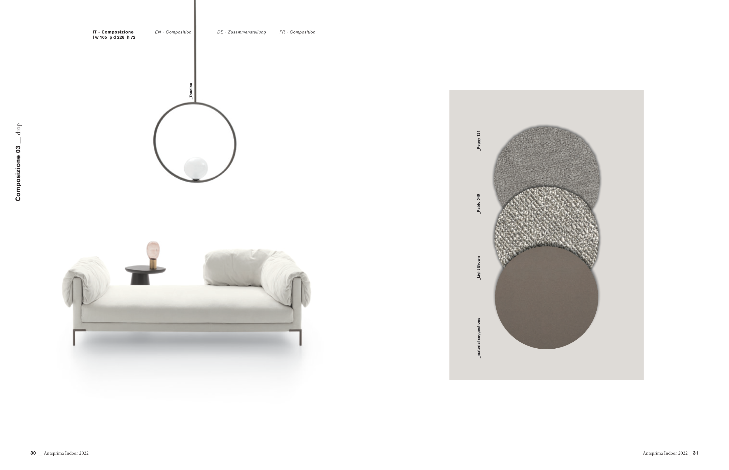 Composizione 03 __ drop _Peggy 121 _Pablo 049 _Light Brown _material suggestions EN - Composition DE - Zusammenstellung FR - Composition IT - Composizione l w 105 p d 226 h 72 _Tondina 30 __ Anteprima Indoor 2022 Anteprima Indoor 2022 _ 31