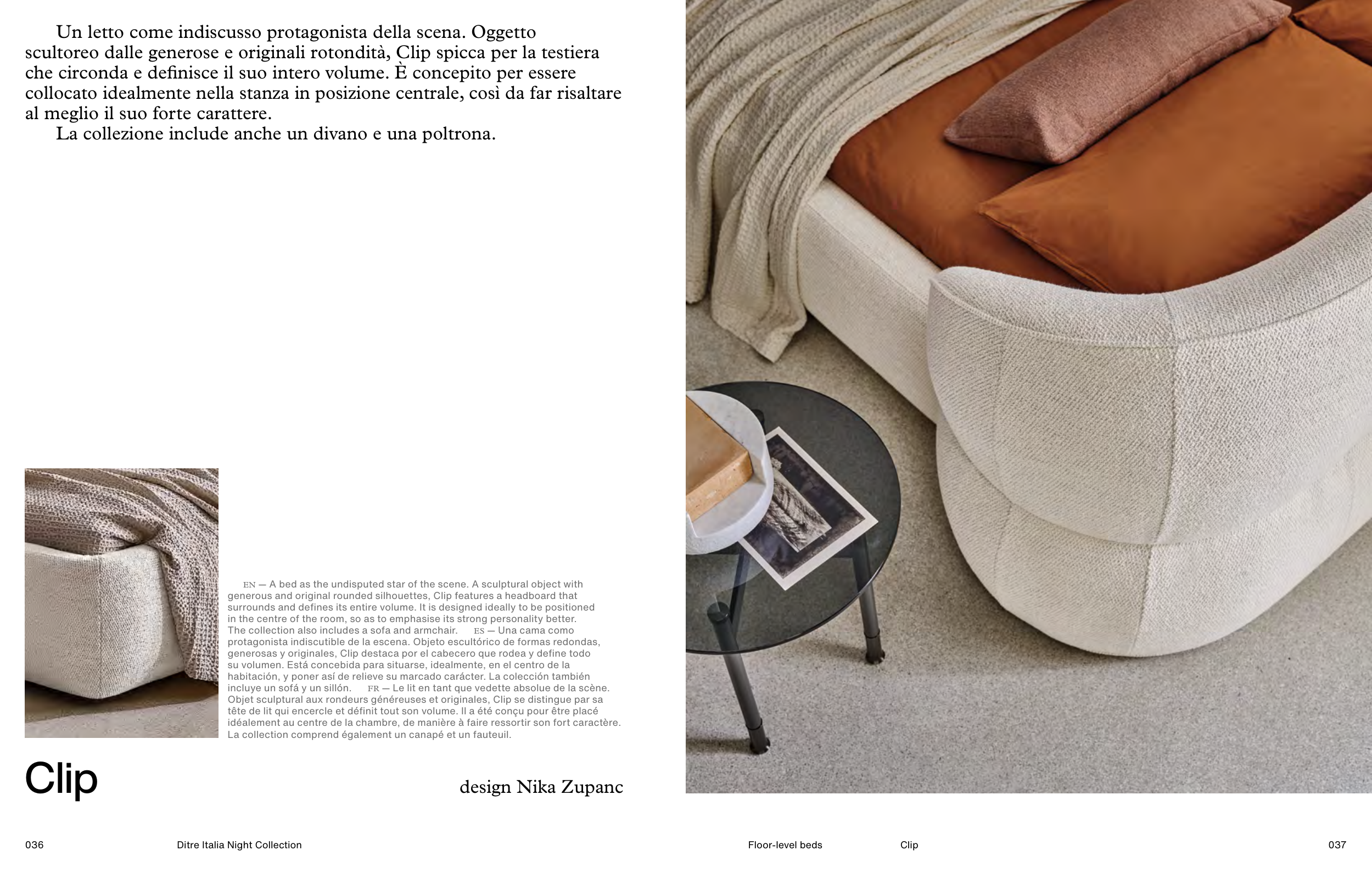 generous and original rounded silhouettes, Clip features a headboard that