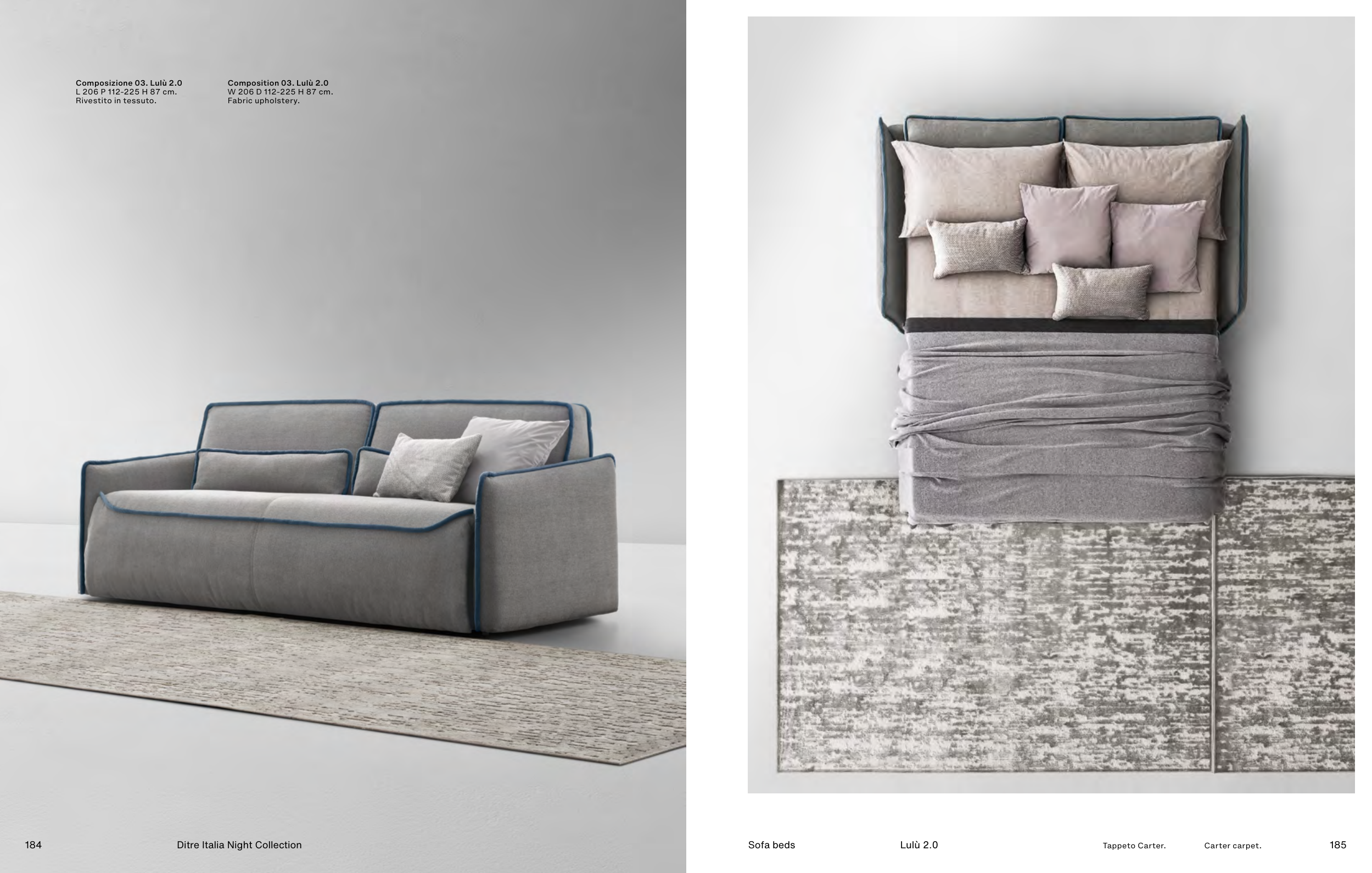 Sofa beds Lulù 2.0 Composizione 03. Lulù 2.0 L 206 P 112-225 H 87 cm. Rivestito in tessuto. Composition 03. Lulù 2.0 W 206 D 112-225 H 87 cm. Fabric upholstery. Carter carpet. Tappeto Carter. 184 185 Ditre Italia Night Collection