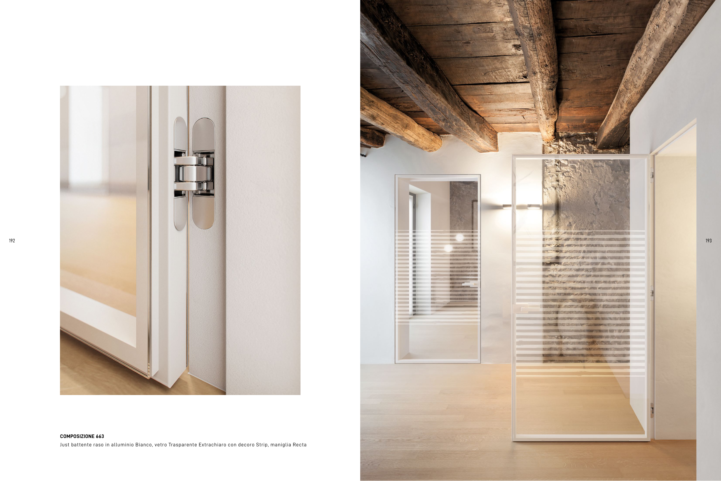 Just battente raso in alluminio Bianco, vetro Trasparente Extrachiaro con decoro Strip, maniglia Recta
