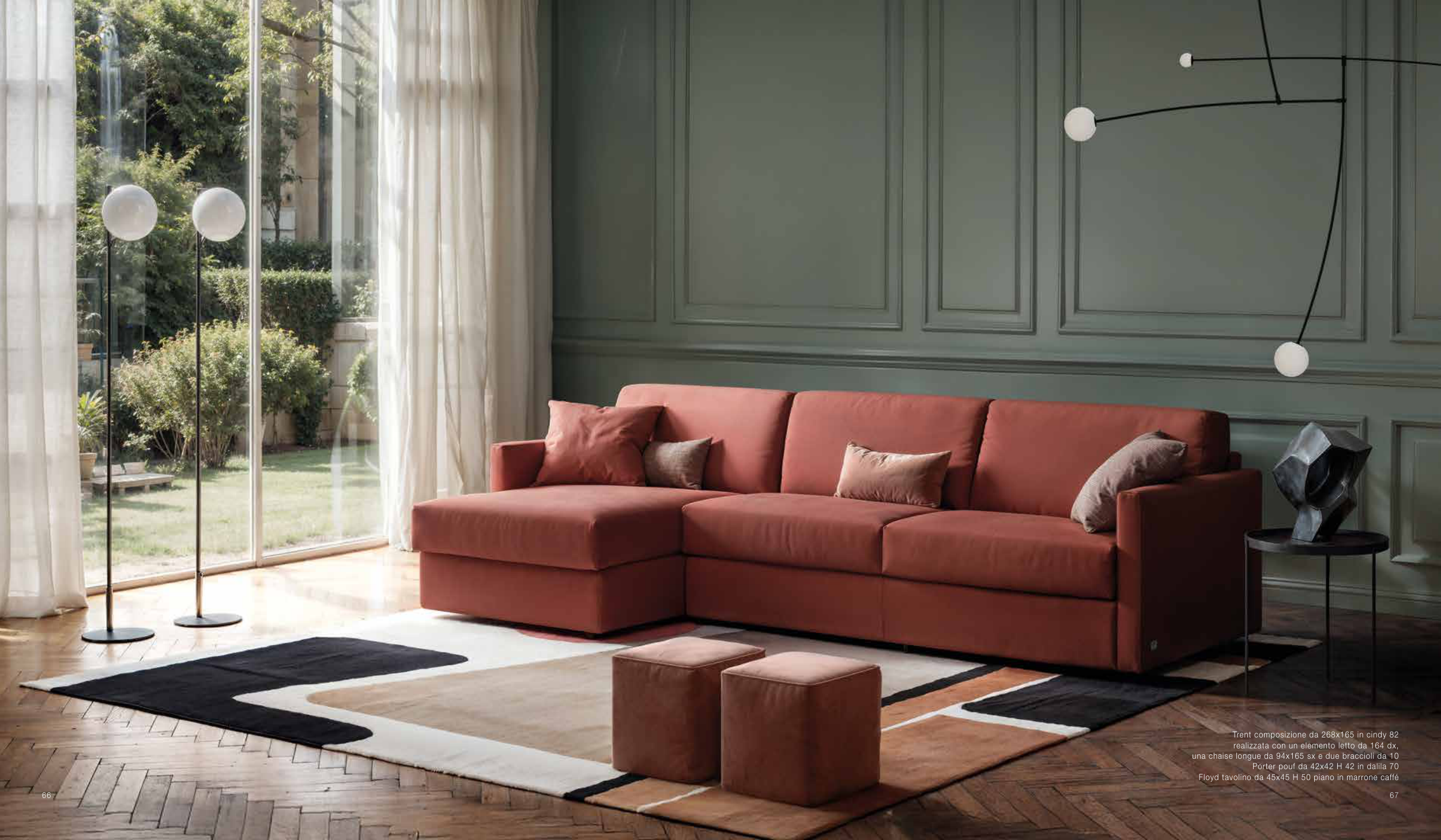 Trent composizione da 268x165 in cindy 82 realizzata con un elemento letto da 164 dx, una chaise longue da 94x165 sx e due braccioli da 10 Porter pouf da 42x42 H 42 in dalila 70 Floyd tavolino da 45x45 H 50 piano in marrone caffé 67 66 67
