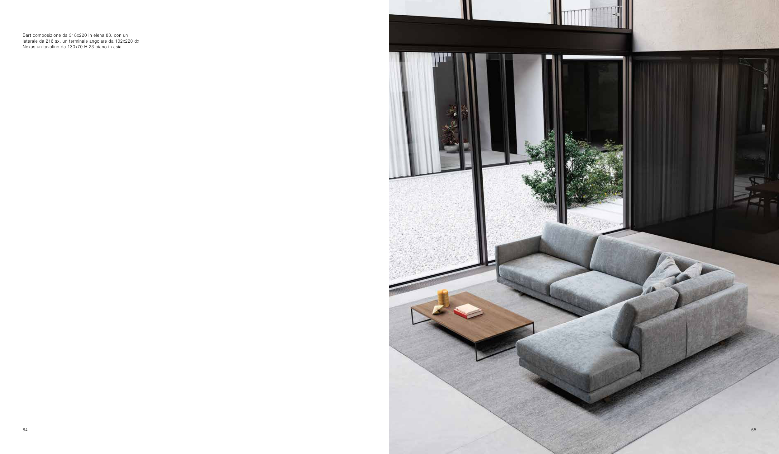 Bart composizione da 318x220 in elena 83, con un laterale da 216 sx, un terminale angolare da 102x220 dx Nexus un tavolino da 130x70 H 23 piano in asia 65 64