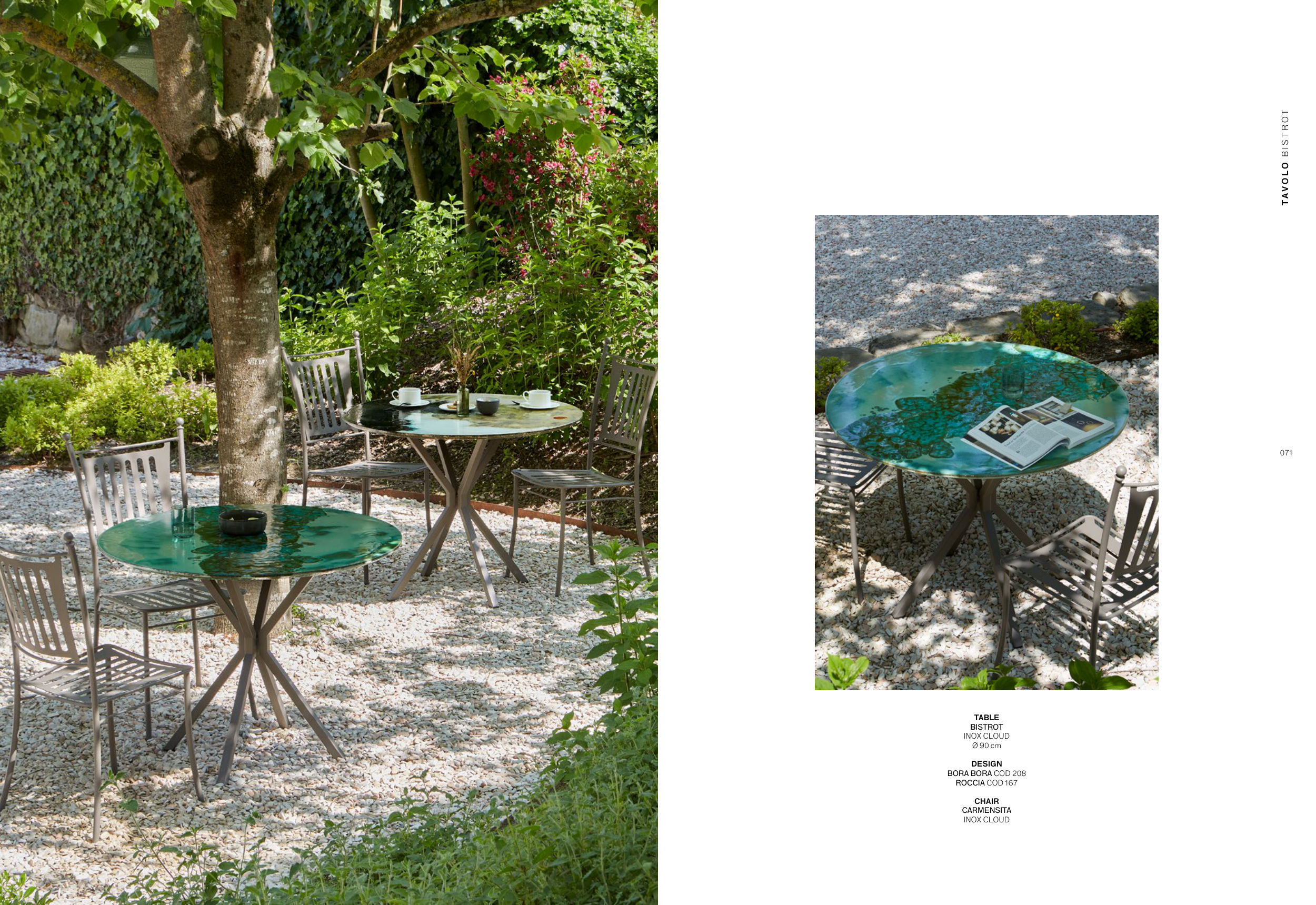 070 071 C O N T E M P O R A R Y TA B L E S TA V O L O B I S T R O T TABLE BISTROT INOX CLOUD Ø 90 cm DESIGN BORA BORA COD 208 ROCCIA COD 167 CHAIR CARMENSITA INOX CLOUD