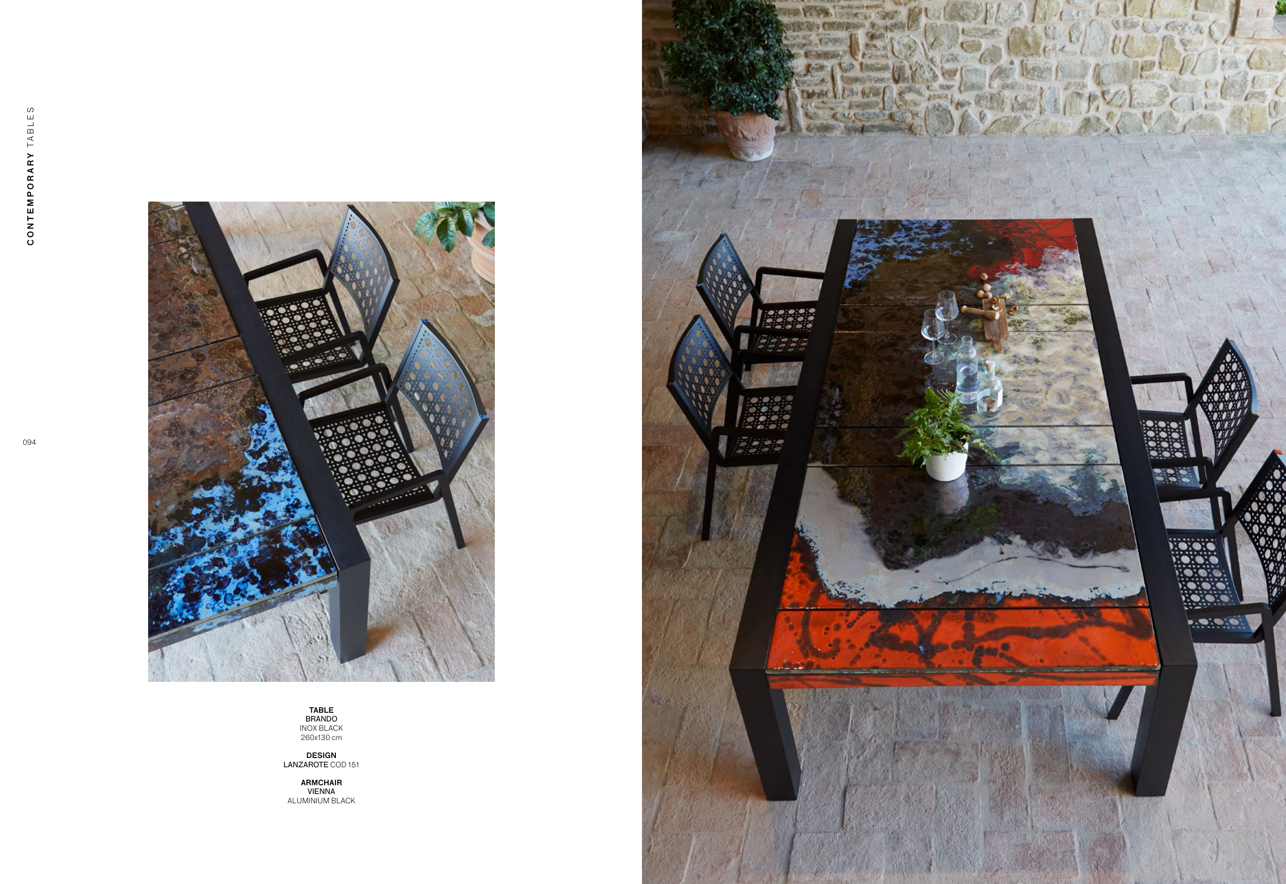 094 095 C O N T E M P O R A R Y TA B L E S TA V O L O B R A N D O TABLE BRANDO INOX BLACK 260x130 cm DESIGN LANZAROTE COD 151 ARMCHAIR VIENNA ALUMINIUM BLACK