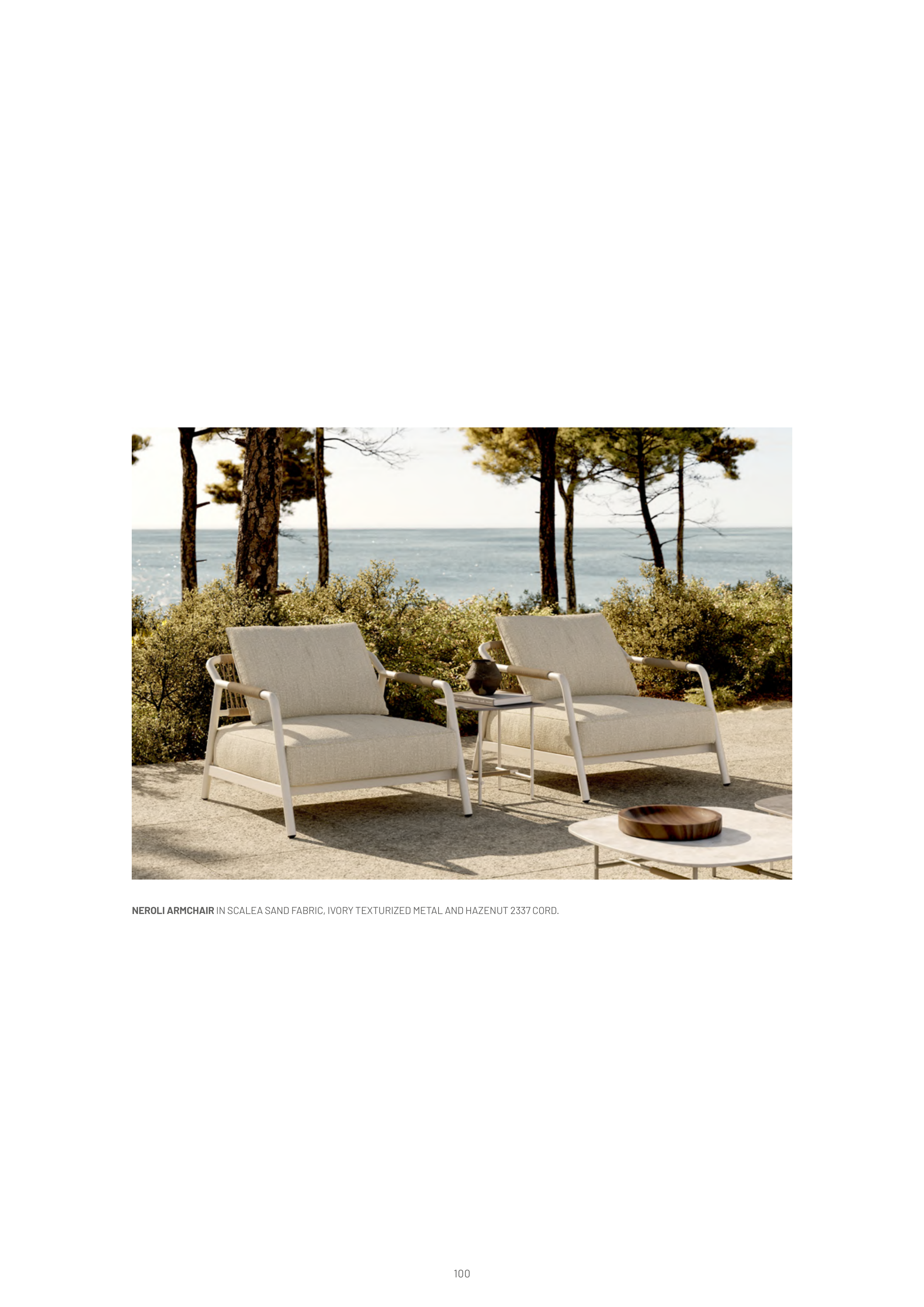 NEROLI ARMCHAIR IN SCALEA SAND FABRIC, IVORY TEXTURIZED METAL AND HAZENUT 2337 CORD.