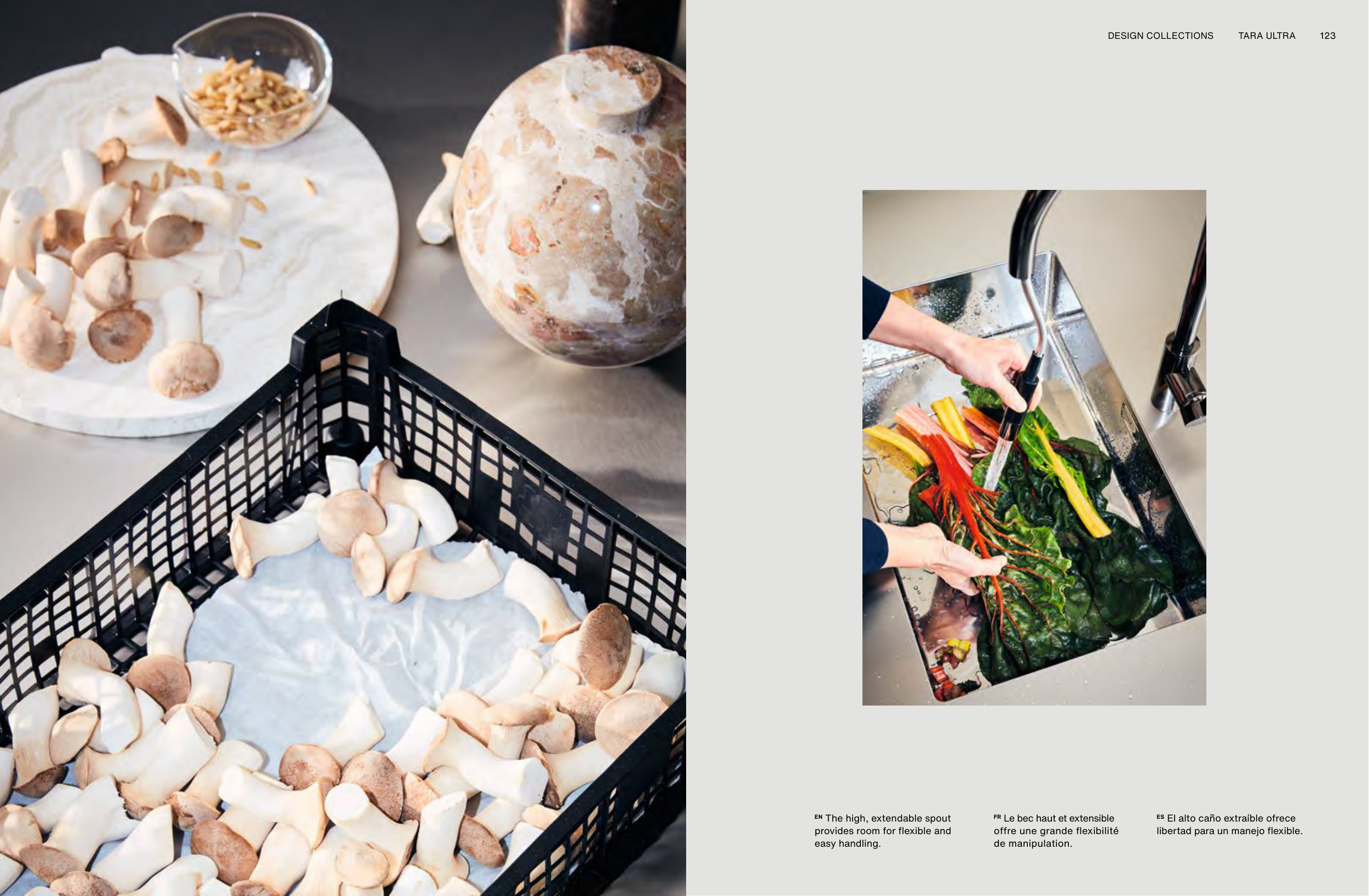 123 TARA ULTRA DESIGN COLLECTIONS EN The high, extendable spout provides room for flexible and easy handling. ES El alto caño extraíble ofrece libertad para un manejo flexible. FR Le bec haut et extensible offre une grande flexibilité de manipulation.