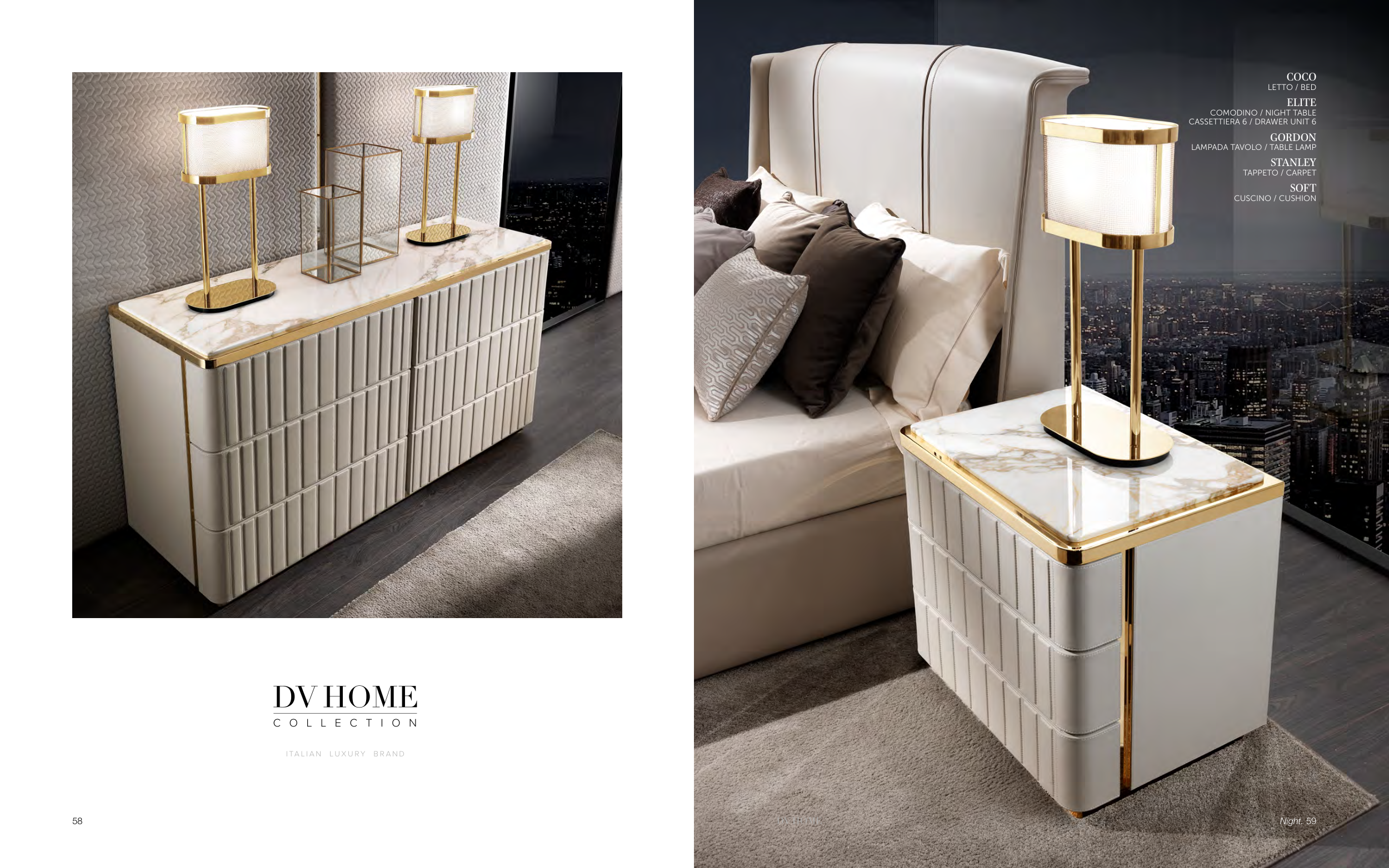 I TA L I A N L U X U R Y B R A N D COCO LETTO / BED ELITE COMODINO / NIGHT TABLE CASSETTIERA 6 / DRAWER UNIT 6 GORDON LAMPADA TAVOLO / TABLE LAMP STANLEY TAPPETO / CARPET SOFT CUSCINO / CUSHION Night. 59 58