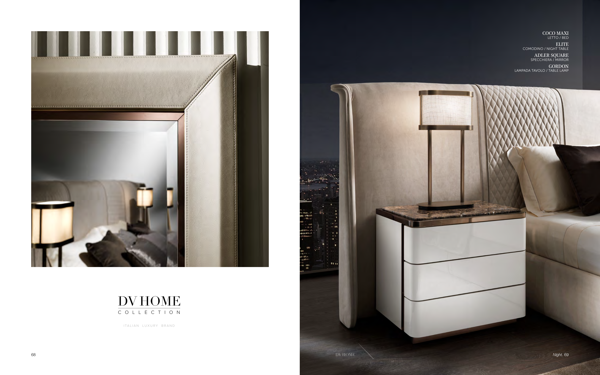 I TA L I A N L U X U R Y B R A N D COCO MAXI LETTO / BED ELITE COMODINO / NIGHT TABLE ADLER SQUARE SPECCHIERA / MIRROR GORDON LAMPADA TAVOLO / TABLE LAMP Night. 69 68