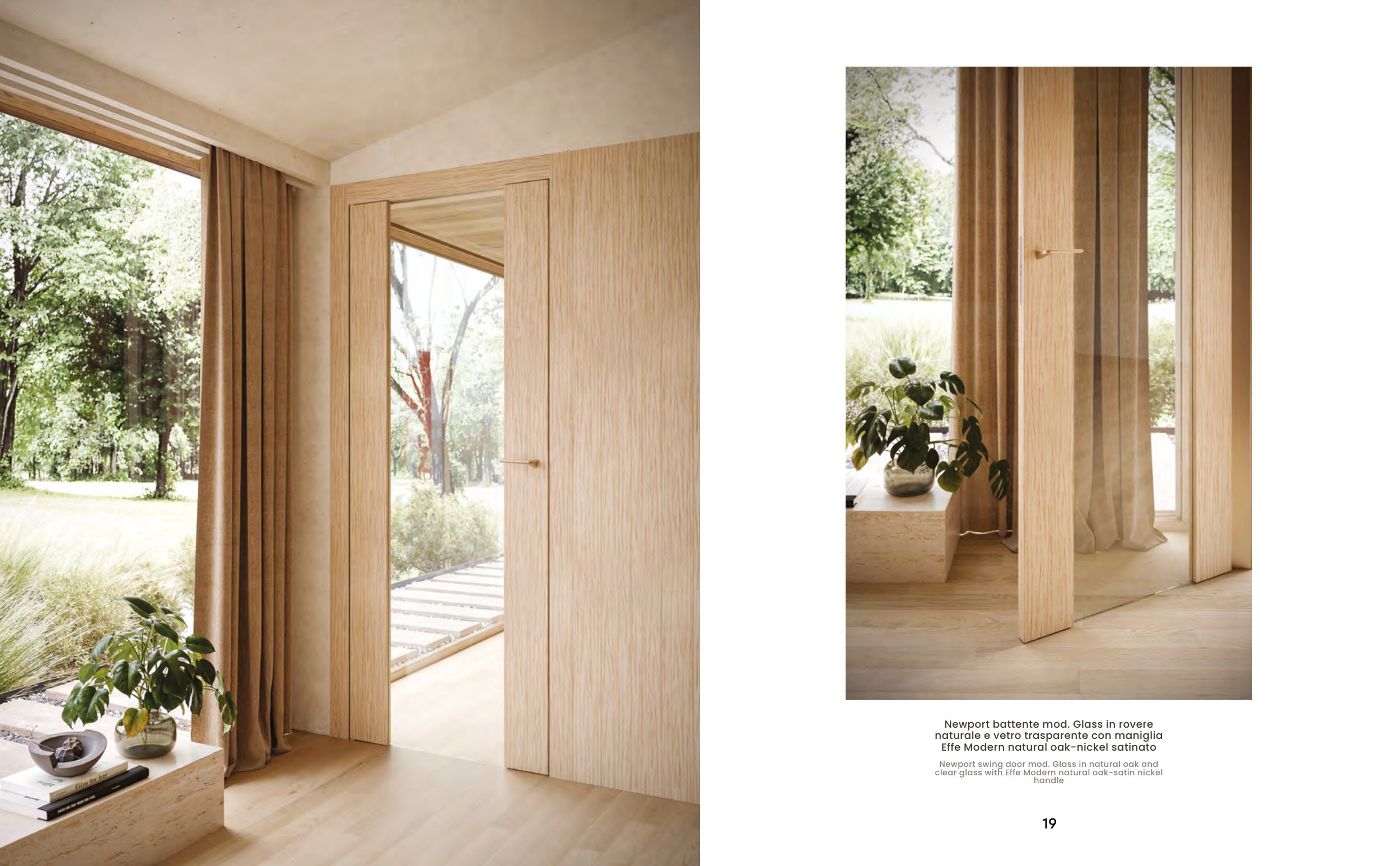 19 Newport battente mod. Glass in rovere naturale e vetro trasparente con maniglia Effe Modern natural oak-nickel satinato Newport swing door mod. Glass in natural oak and clear glass with Effe Modern natural oak-satin nickel handle