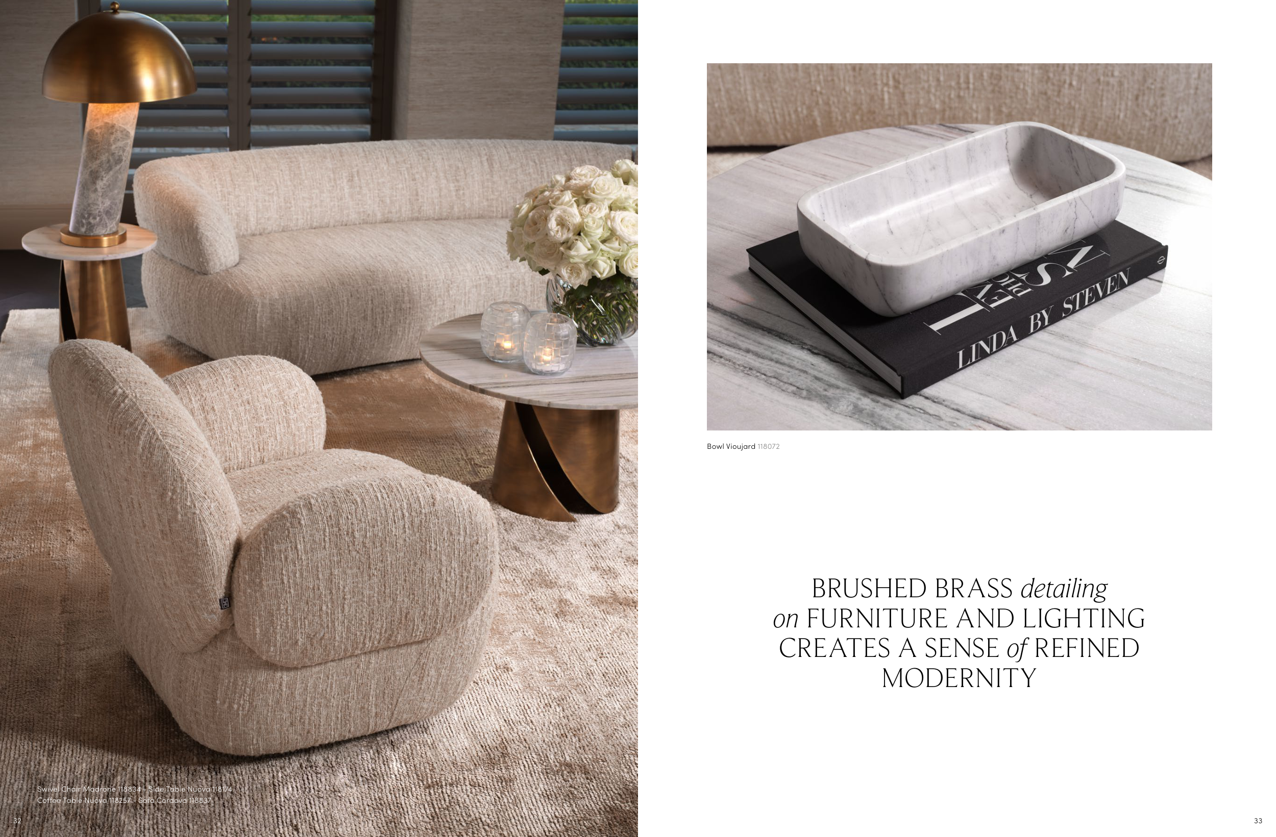 33 32 BRUSHED BRASS detailing on FURNITURE AND LIGHTING CREATES A SENSE of REFINED MODERNITY Bowl Vioujard 118072 Swivel Chair Madrone 118834 - Side Table Nuova 118174 Coffee Table Nuova 118257 - Sofa Cordova 118837