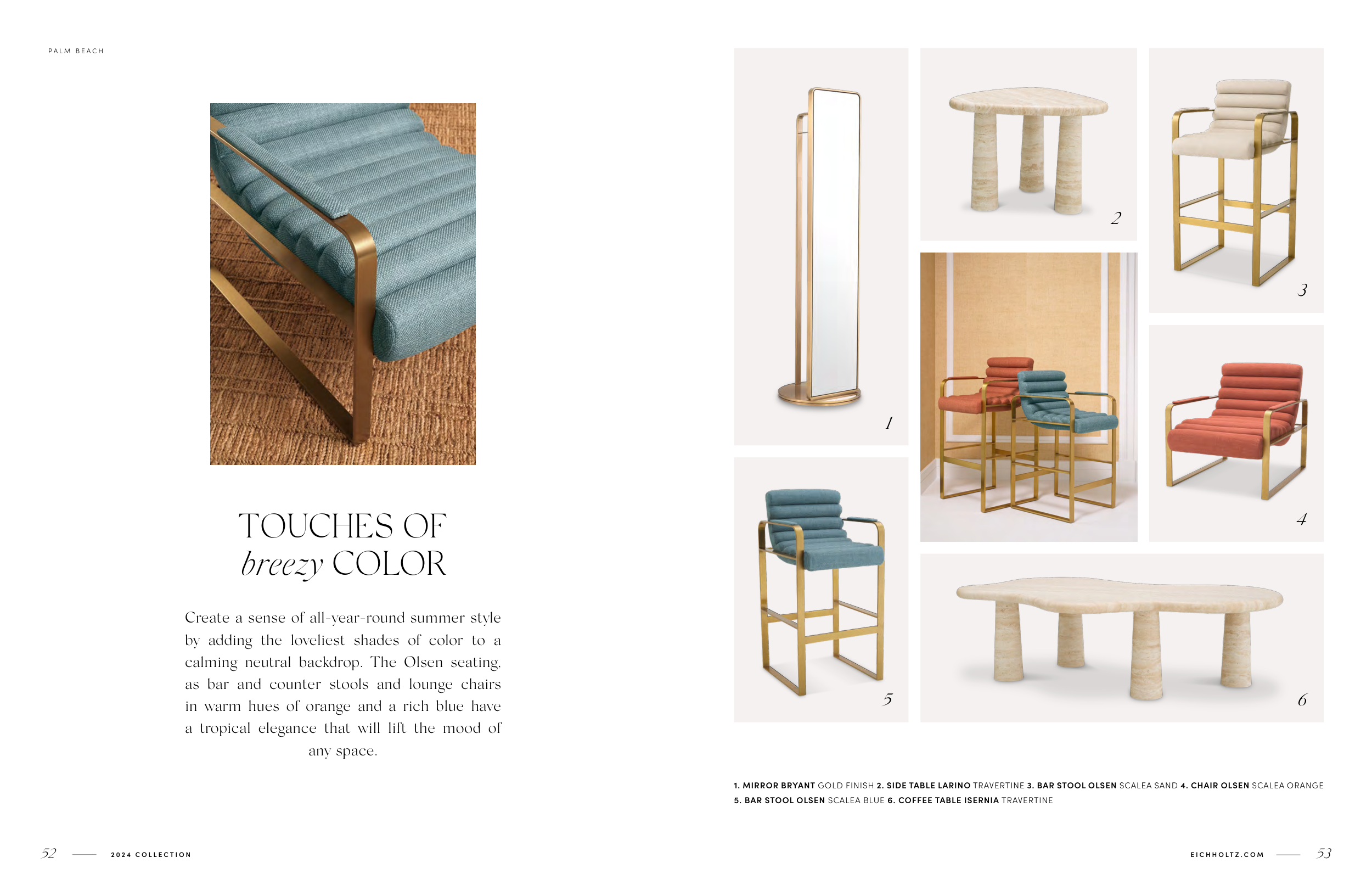 1. MIRROR BRYANT GOLD FINISH 2. SIDE TABLE LARINO TRAVERTINE 3. BAR STOOL OLSEN SCALEA SAND 4. CHAIR OLSEN SCALEA ORANGE