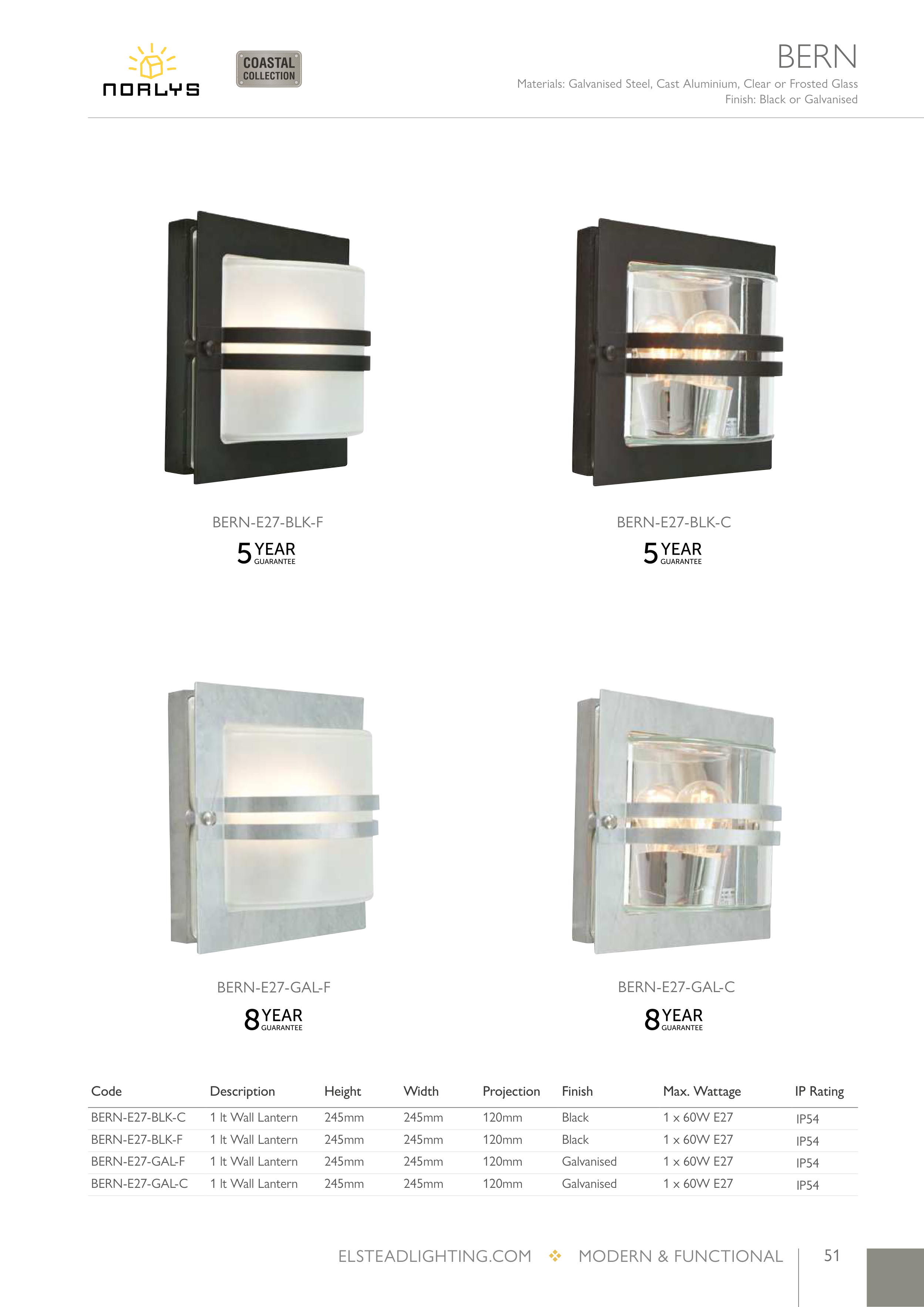 Materials: Galvanised Steel, Cast Aluminium, Clear or Frosted Glass