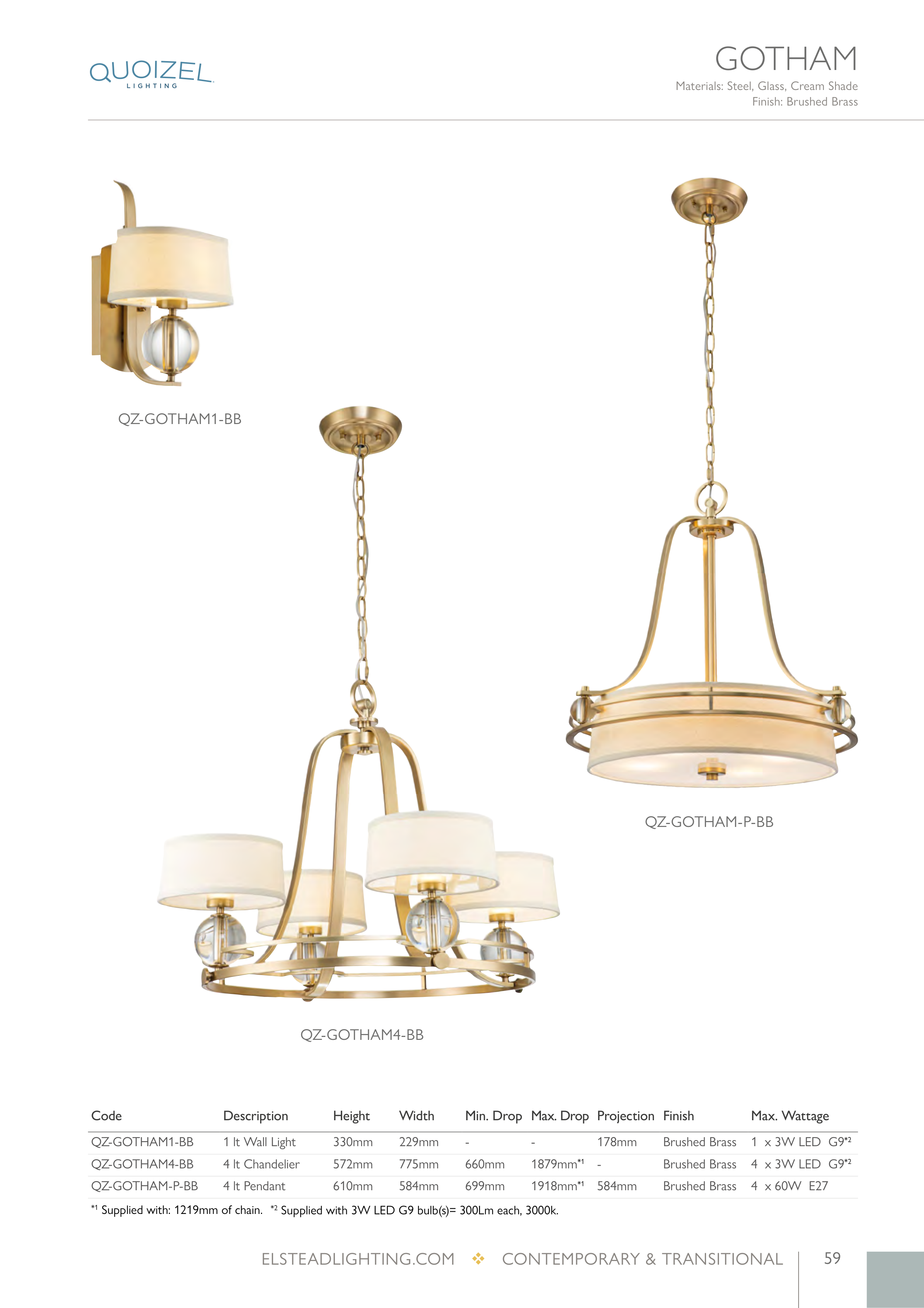 *1 Supplied with: 1219mm of chain. *2 Supplied with 3W LED G9 bulb(s)= 300Lm each, 3000k.