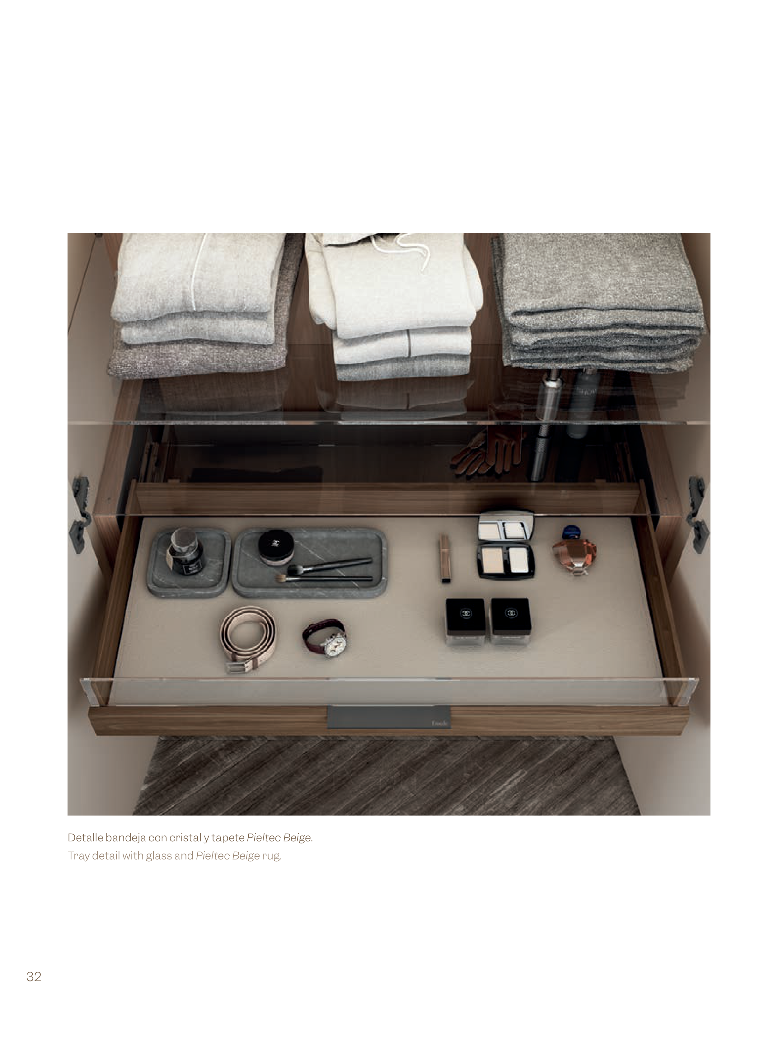 Detalle bandeja con cristal y tapete Pieltec Beige.