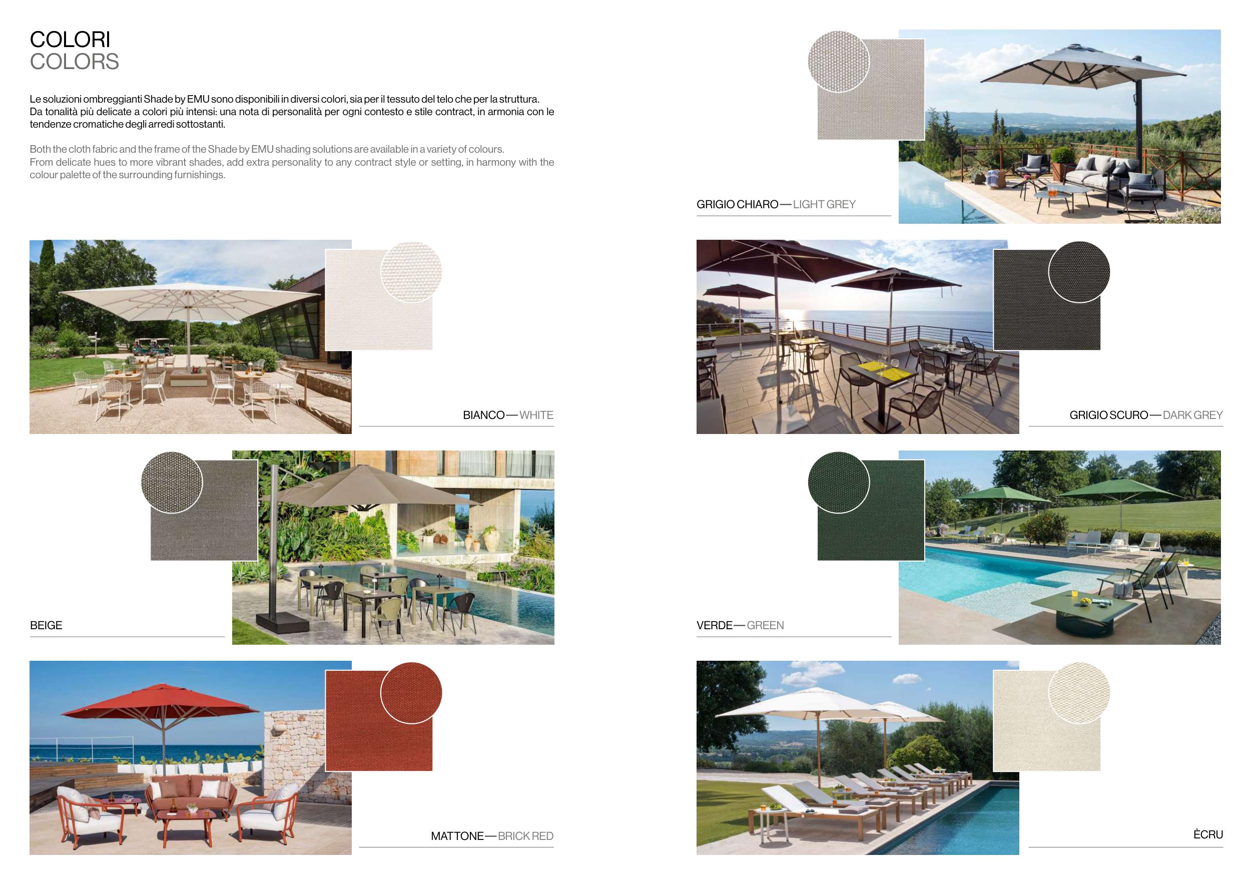 Le soluzioni ombreggianti Shade by EMU sono disponibili in diversi colori, sia per il tessuto del telo che per la struttura.