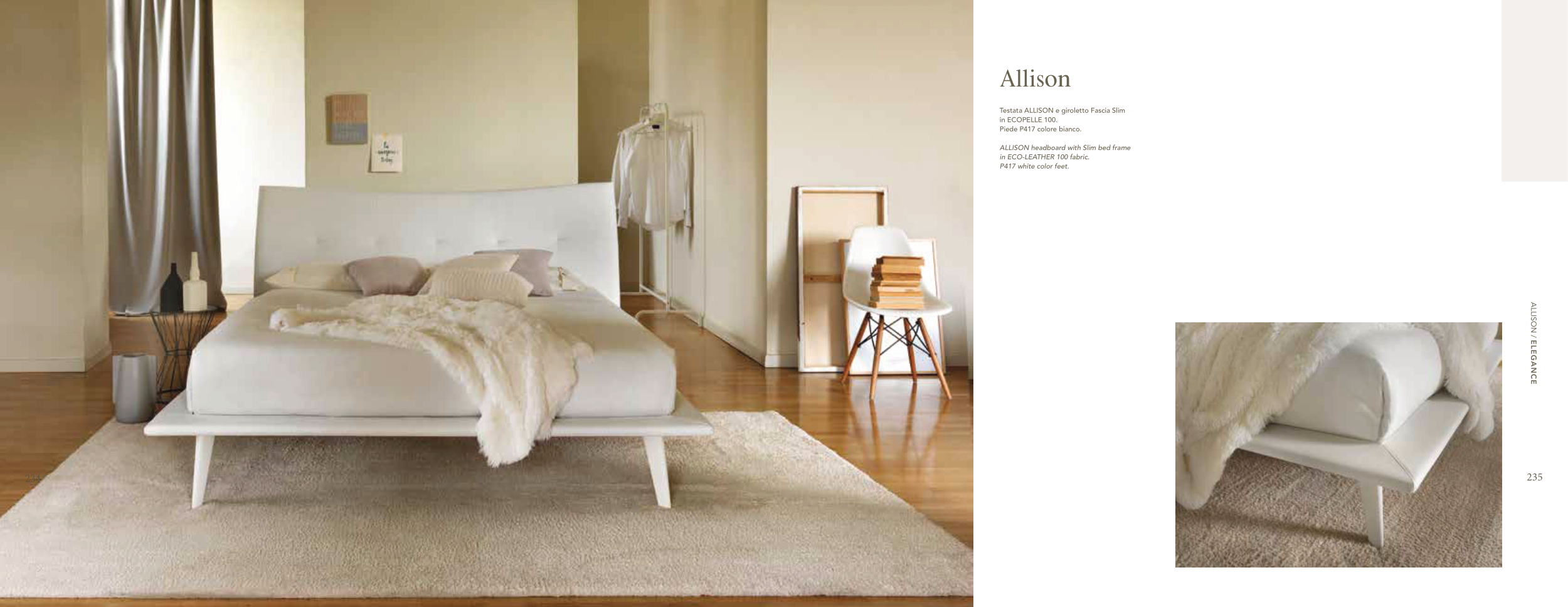 Allison Testata ALLISON e giroletto Fascia Slim in ECOPELLE 100. Piede P417 colore bianco. ALLISON headboard with Slim bed frame in ECO-LEATHER 100 fabric. P417 white color feet. ALLISON / ELEGANCE 234 235
