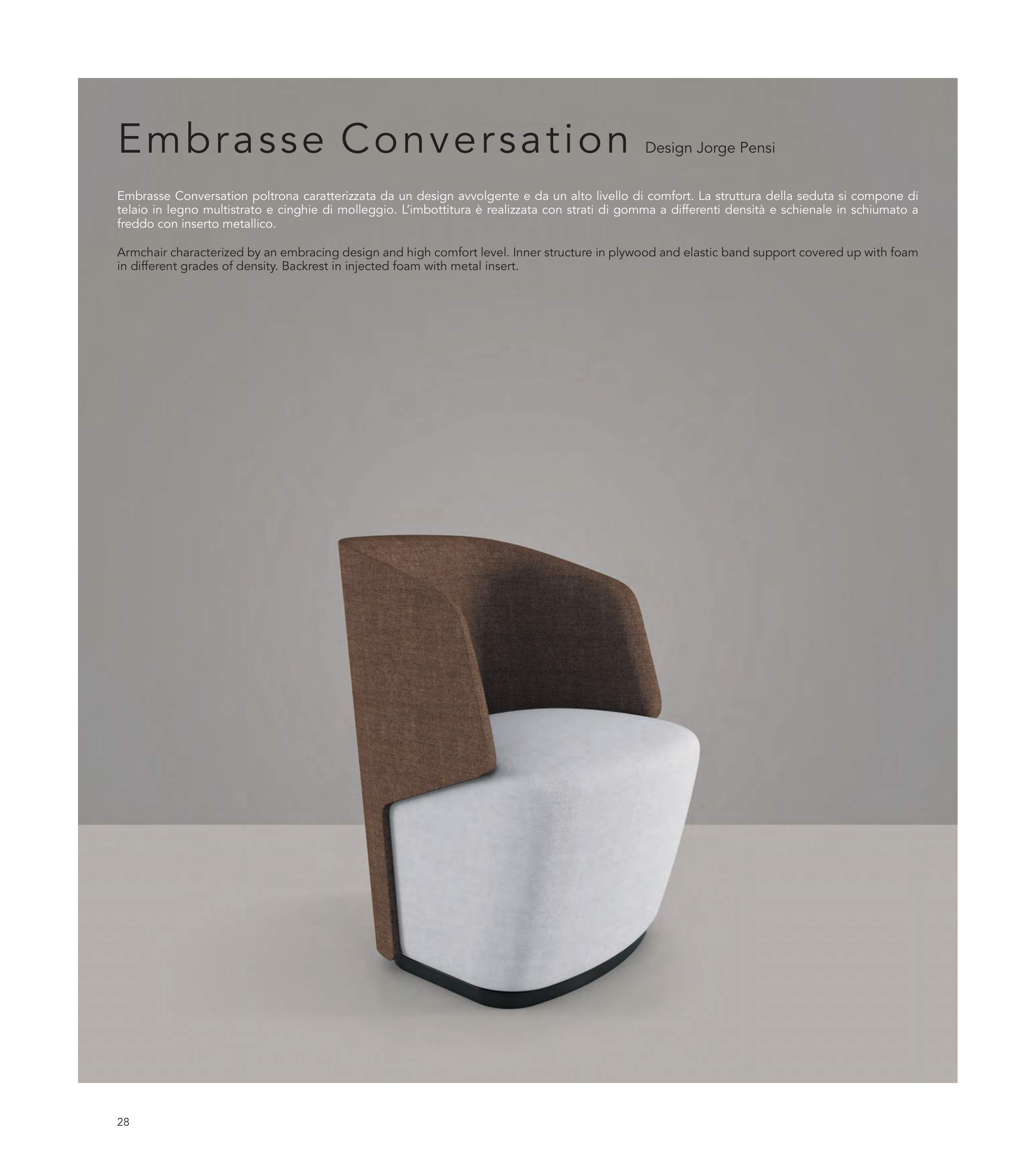 Armchair characterized by an embracing design and high comfort level. Inner structure in plywood and elastic band support covered up with foam