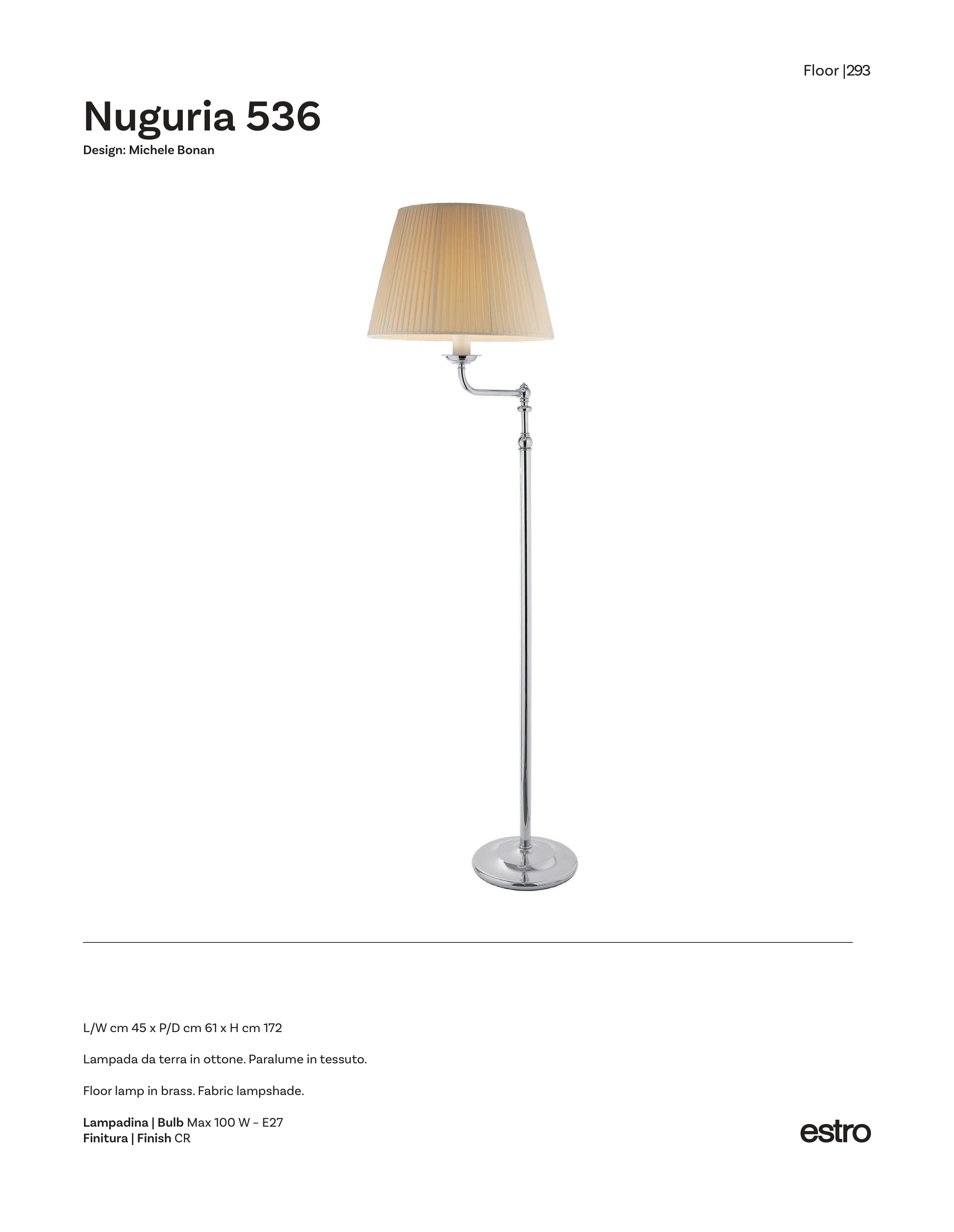 293 Floor | L/W cm 45 x P/D cm 61 x H cm 172 Lampada da terra in ottone. Paralume in tessuto. Floor lamp in brass. Fabric lampshade. Lampadina | Bulb Max 100 W – E27 Finitura | Finish CR Nuguria 536 Design: Michele Bonan