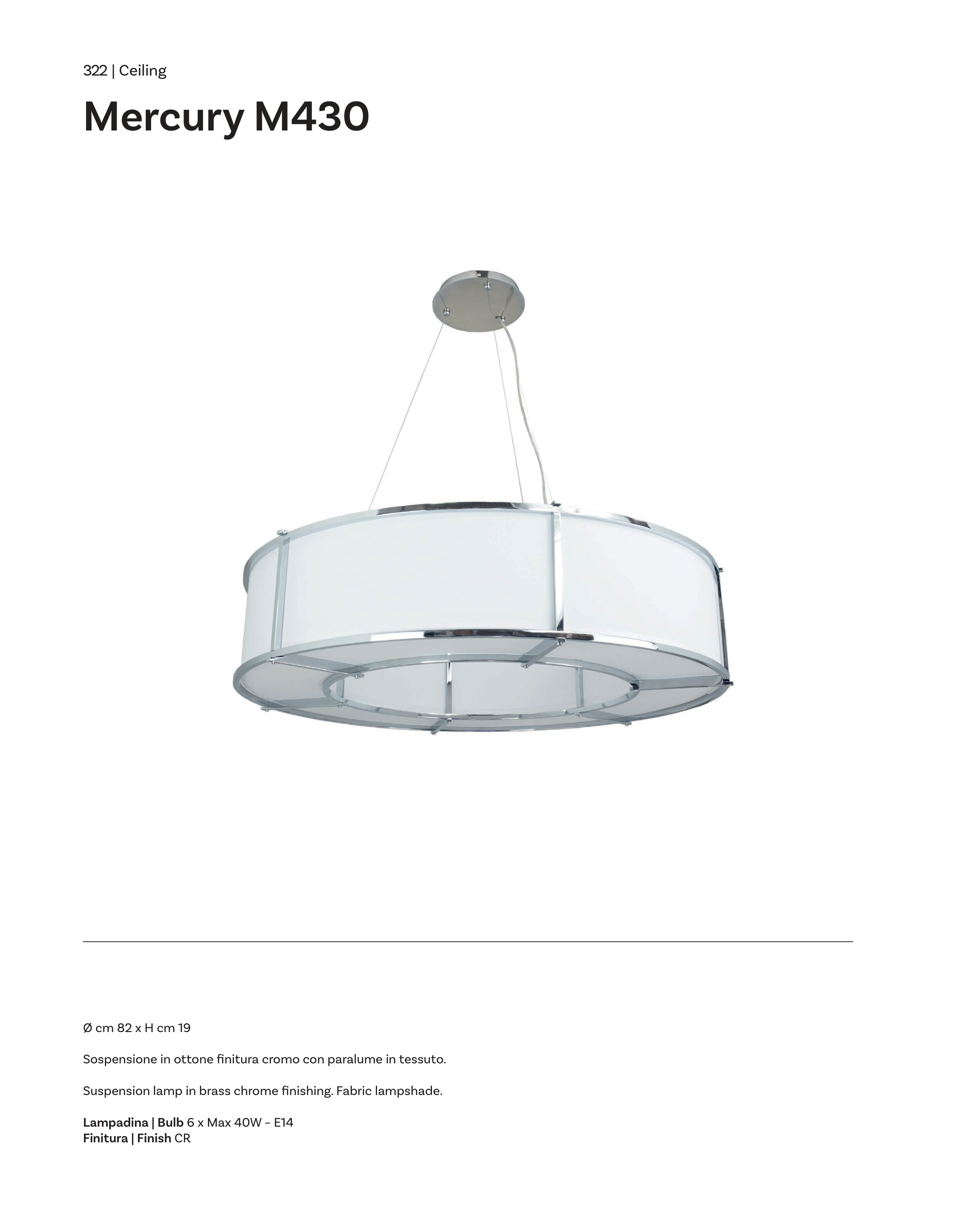 322 | Ceiling Mercury M430 Ø cm 82 x H cm 19 Sospensione in ottone finitura cromo con paralume in tessuto. Suspension lamp in brass chrome finishing. Fabric lampshade. Lampadina | Bulb 6 x Max 40W – E14 Finitura | Finish CR