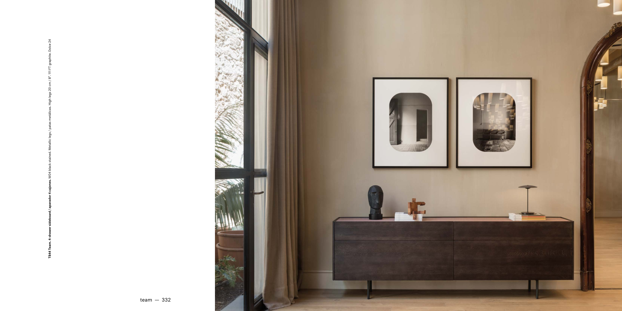 nombre colección (minúsculas) — 333 T844 Team. 4-drawer sideboard / aparador 4 cajones. W04 black stained. Metallic legs / patas metálicas. High legs 20 cm / 8”. 111 FT graphite. Dolce 24 team — 332