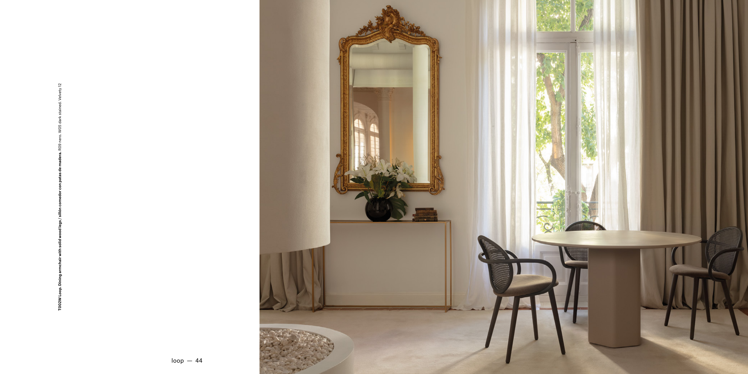 T002W Loop. Dining armchair with solid wood legs / sillón comedor con patas de madera. R09 nero. W05 dark stained. Velvety 12