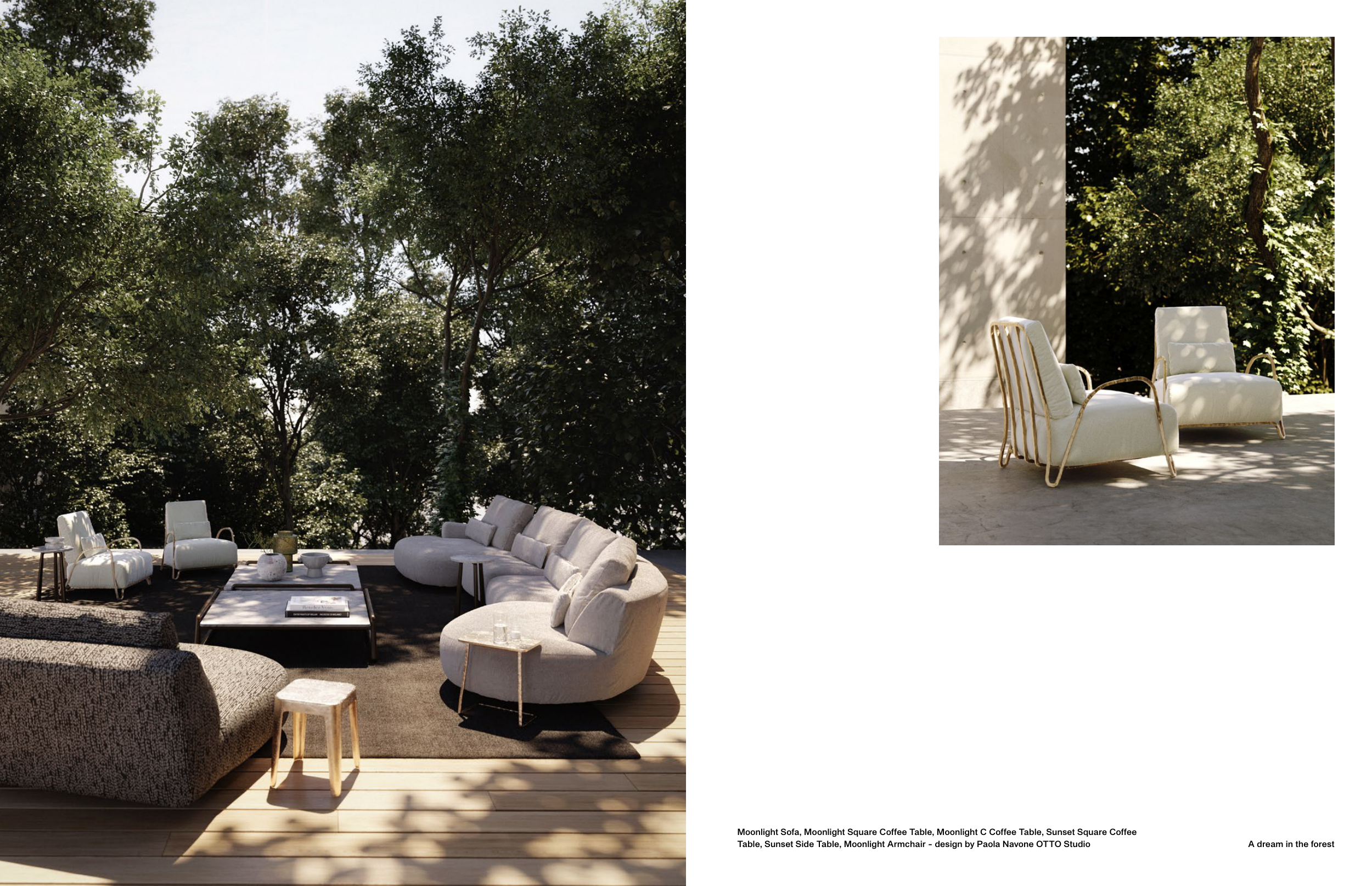 A dream in the forest Moonlight Sofa, Moonlight Square Coffee Table, Moonlight C Coffee Table, Sunset Square Coffee Table, Sunset Side Table, Moonlight Armchair - design by Paola Navone OTTO Studio
