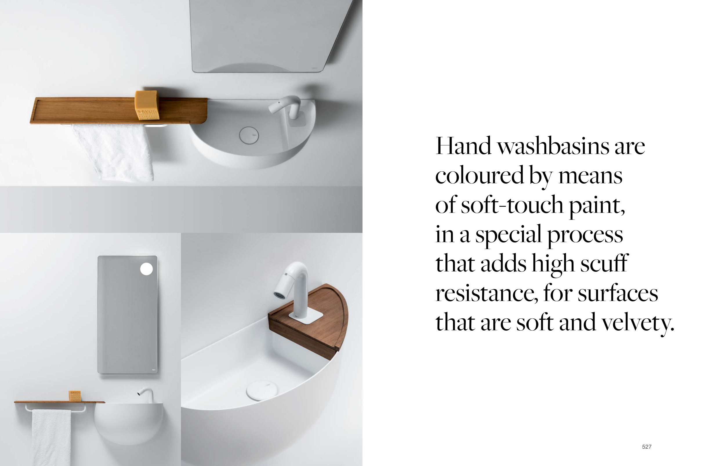 527 Hand washbasins are coloured by means of soft-touch paint, in a special process that adds high scuff resistance, for surfaces that are soft and velvety.