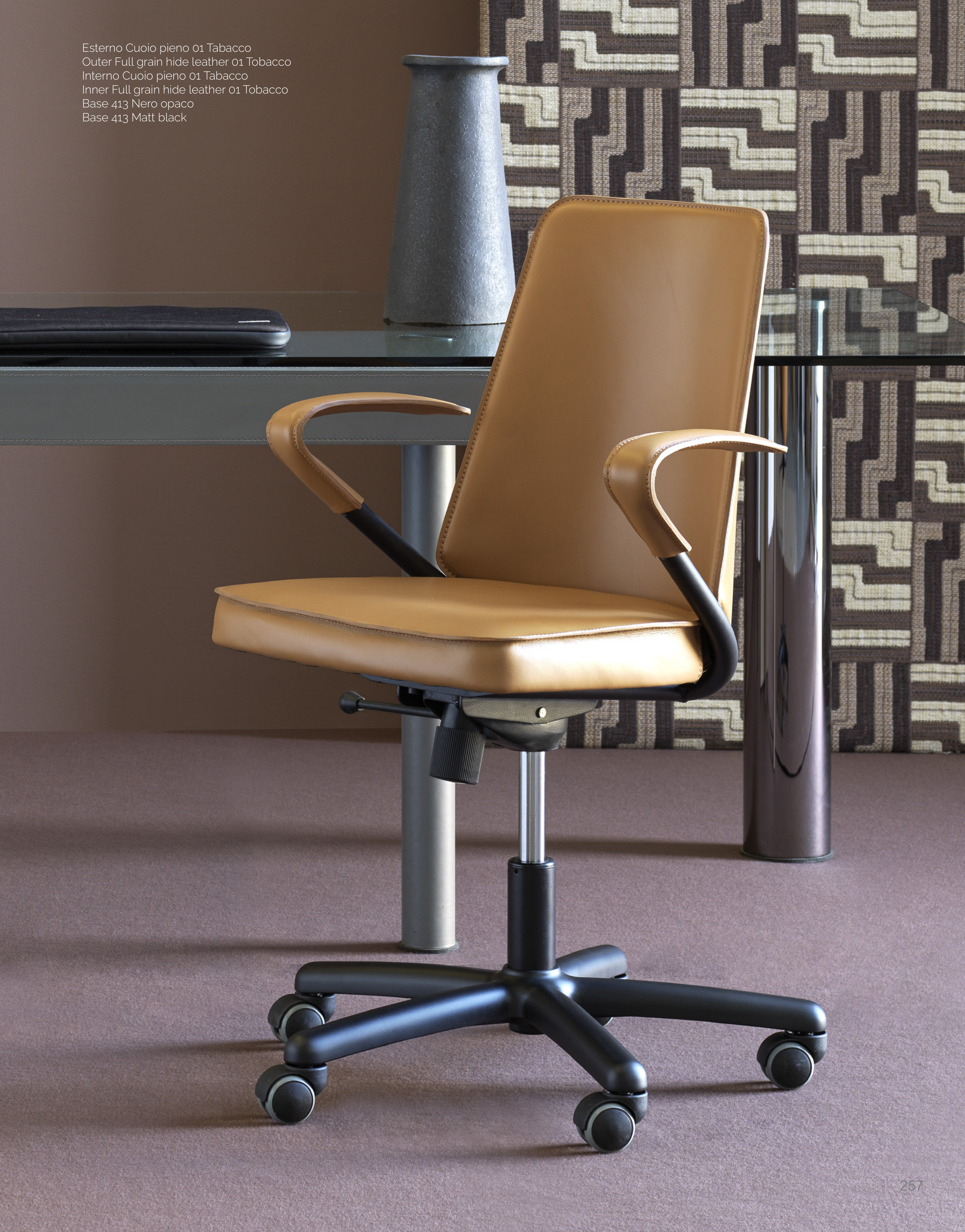 Esterno Cuoio pieno 01 Tabacco Outer Full grain hide leather 01 Tobacco Interno Cuoio pieno 01 Tabacco Inner Full grain hide leather 01 Tobacco Base 413 Nero opaco Base 413 Matt black 257