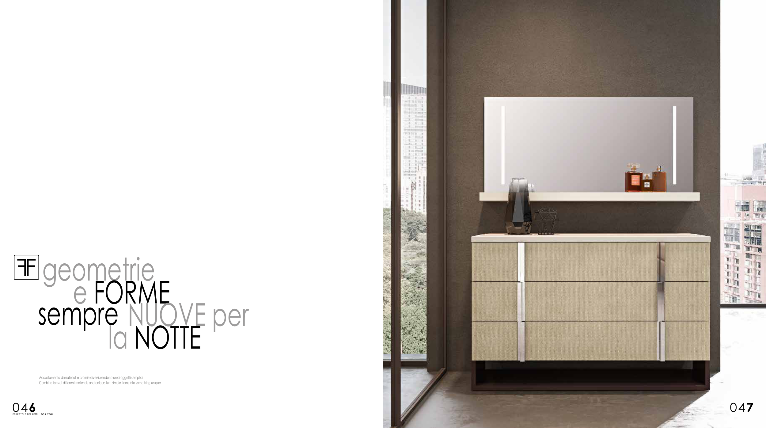 FERRETTI E FERRETTI . FOR YOU geometrie e FORME sempre NUOVE per la NOTTE Accostamento di materiali e cromie diversi, rendono unici oggetti semplici Combinations of different materials and colours turn simple items into something unique 047 046