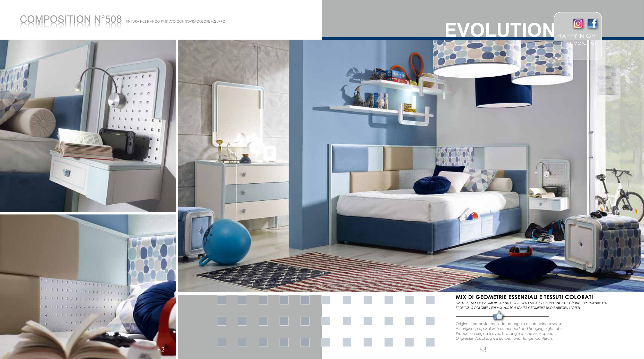Originale proposta con letto ad angolo e comodino sospeso.