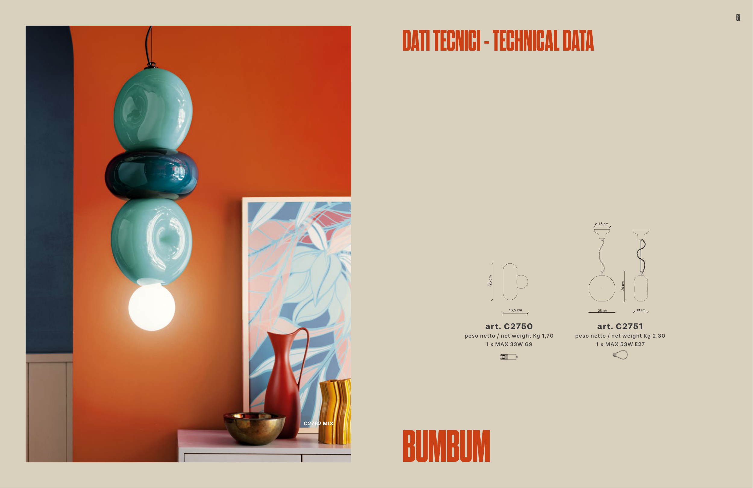 61 BUMBUM DATI TECNICI - TECHNICAL DATA 25 cm 16,5 cm art. C2750 peso netto / net weight Kg 1,70 1 x MAX 33W G9 art. C2751 peso netto / net weight Kg 2,30 1 x MAX 53W E27 C2762 MIX