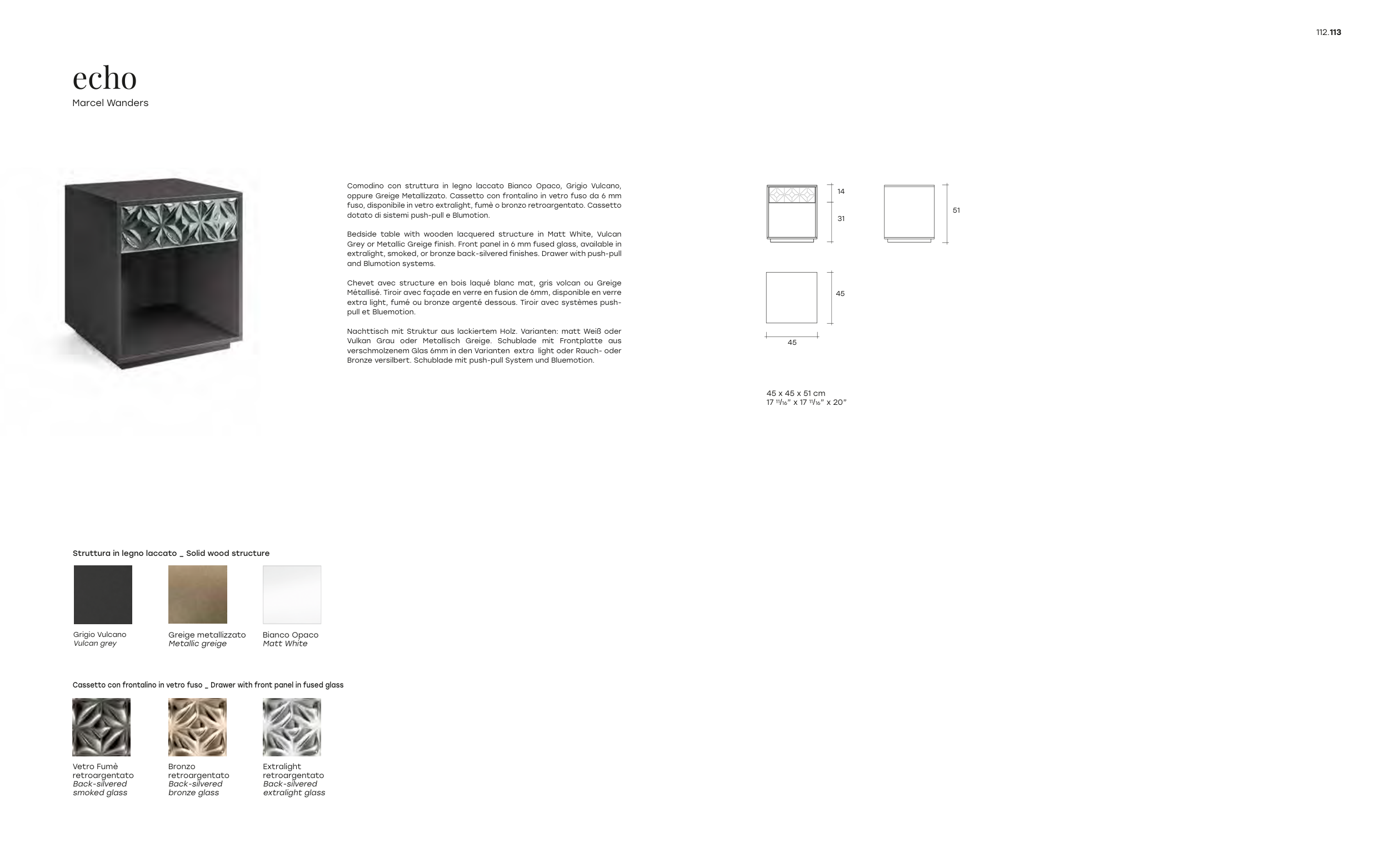 extralight, smoked, or bronze back-silvered finishes. Drawer with push-pull