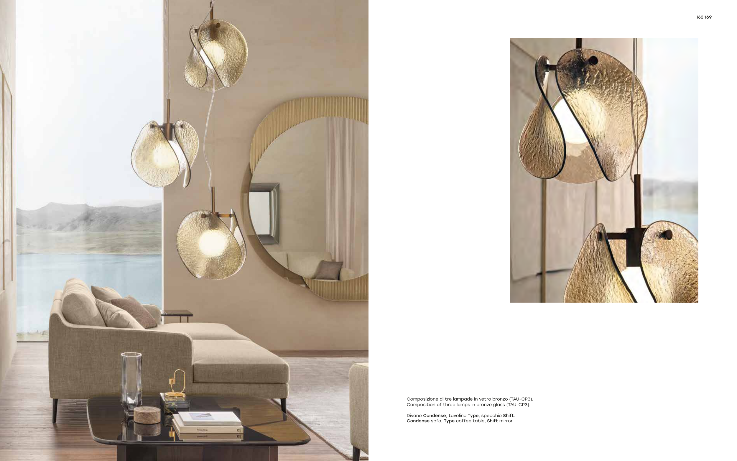 168.169 Composizione di tre lampade in vetro bronzo (TAU-CP3). Composition of three lamps in bronze glass (TAU-CP3). Divano Condense, tavolino Type, specchio Shift. Condense sofa, Type coffee table, Shift mirror.